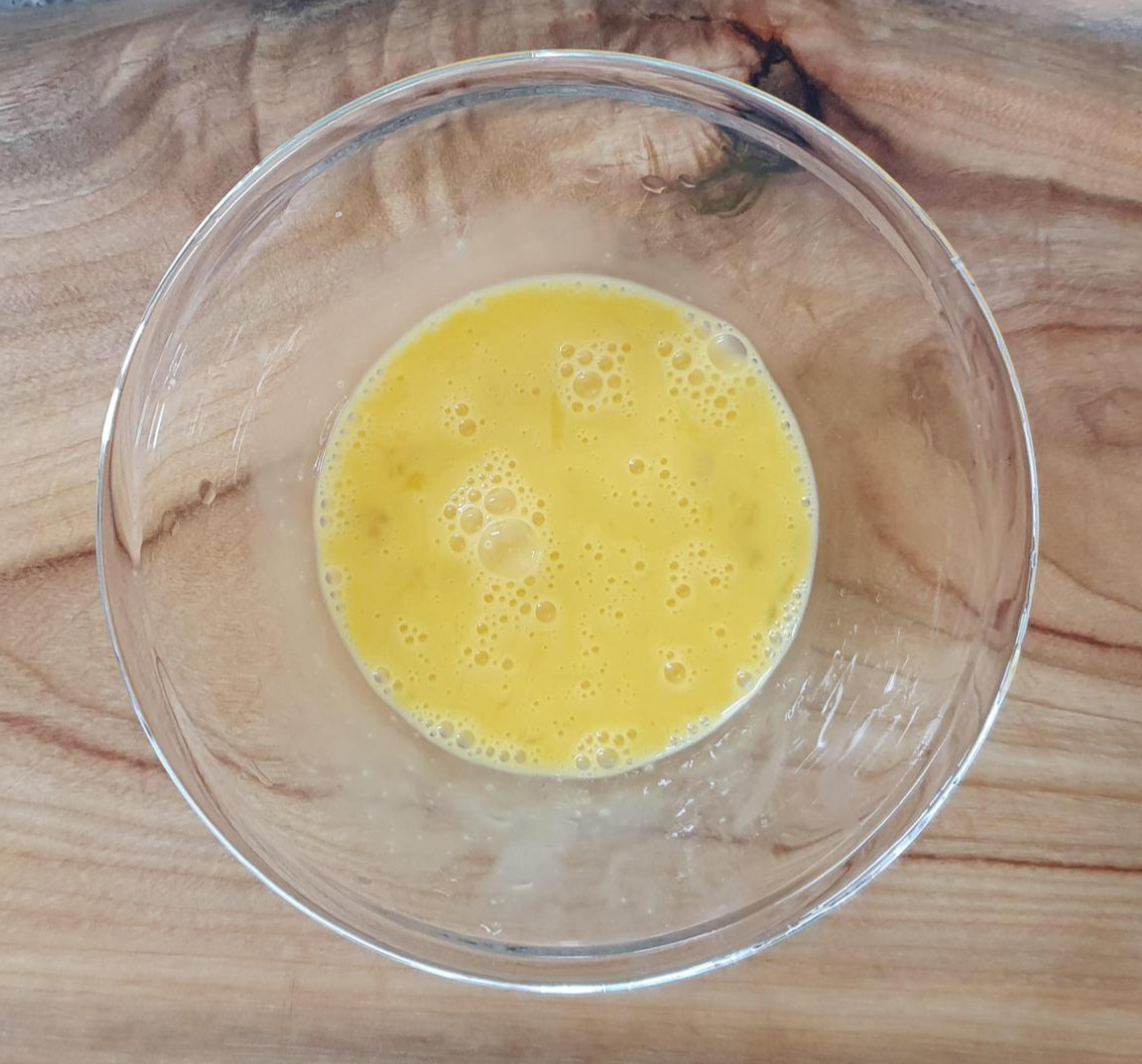 저는 계란 2개를 이용해 계란물을 만들었고 , 코팅된 팬 위에 기름을 두른 뒤 , 약불로 천천히 익혀 주었습니다.