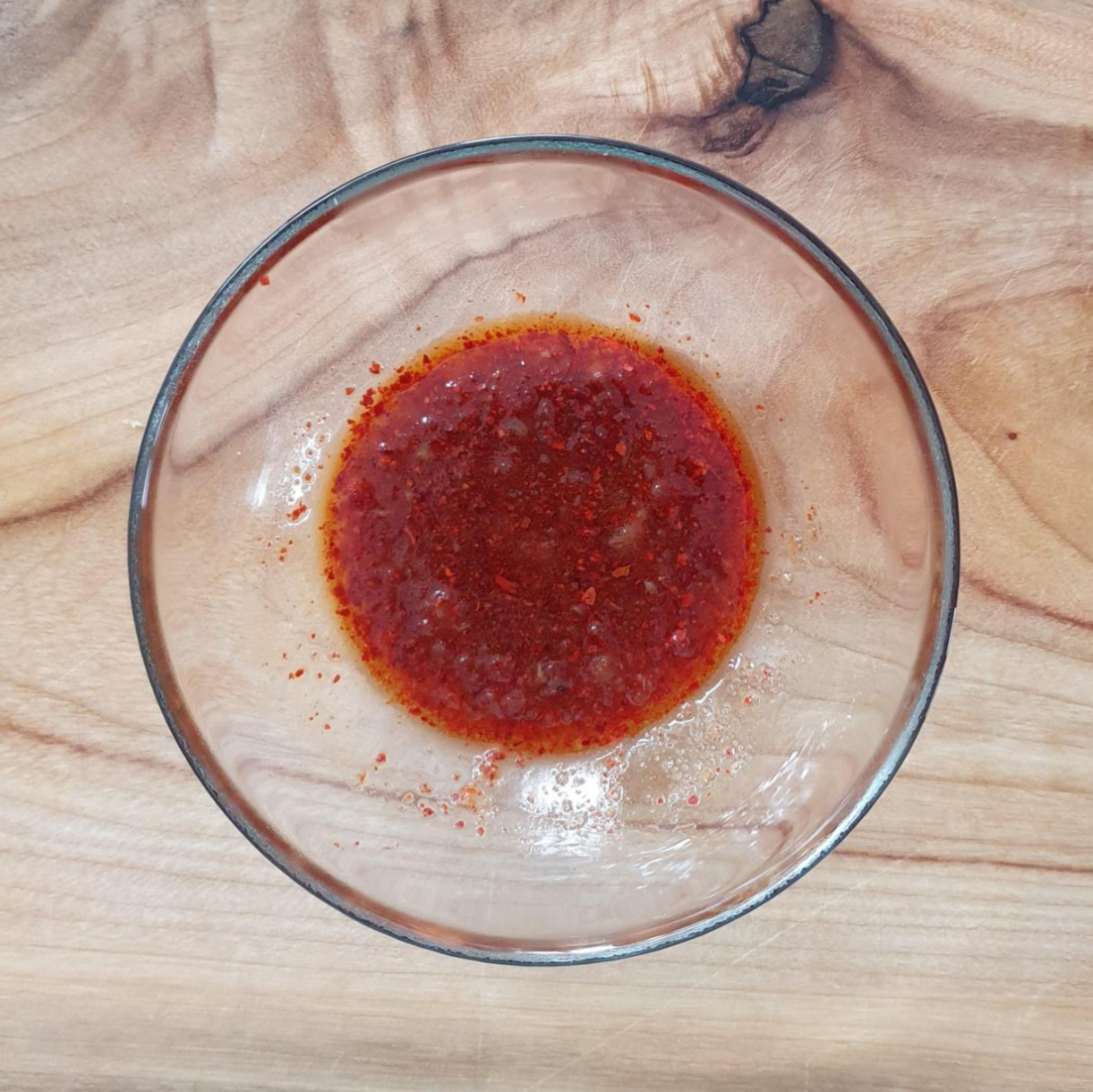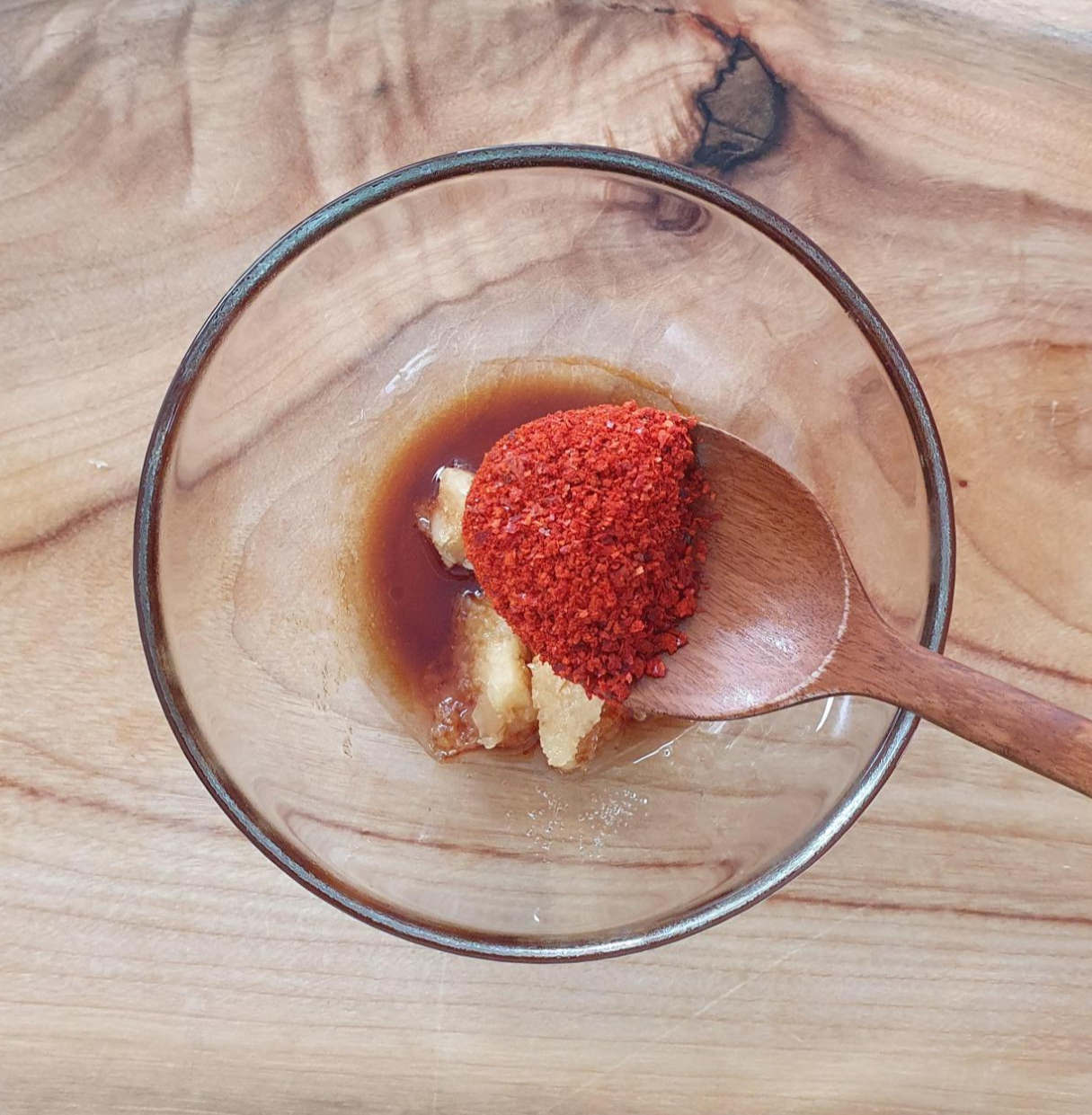 마지막으로 고추가루 반 스푼을 추가하시면서 양념장 재료는 모두 마무리됩니다.