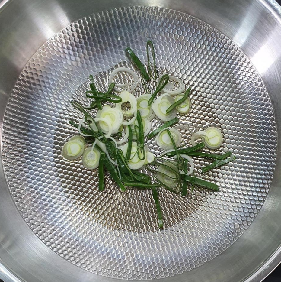 팬 위에 기름을 살짝 두른 뒤에 파를 먼저 볶아줍니다. 파 기름을 내기 위함이니 참고해 주시고, 어느 정도 파가 볶아질 때까지 볶기 작업을 지속해 주세요.