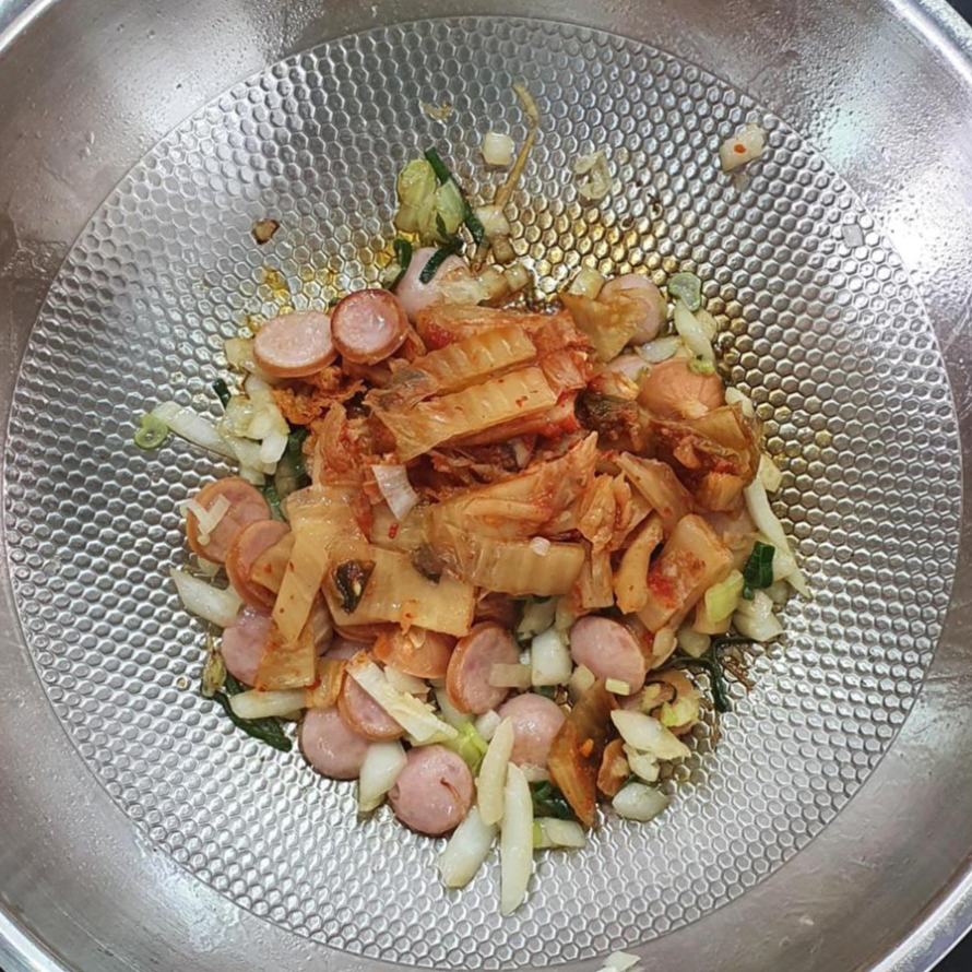 | 재료 준비 김치 1컵정도 분량 / 다진양파 (1/4개) / 대파 한줌 / 소세지 적당량 (기호에 따라) / 계란 2개 양념 준비 다진마늘 1스푼 / 고추가루 1스푼 / 간장 1스푼 / 설탕 반스푼 / 참기름 1스푼 / 물 (소주컵1컵정도) |