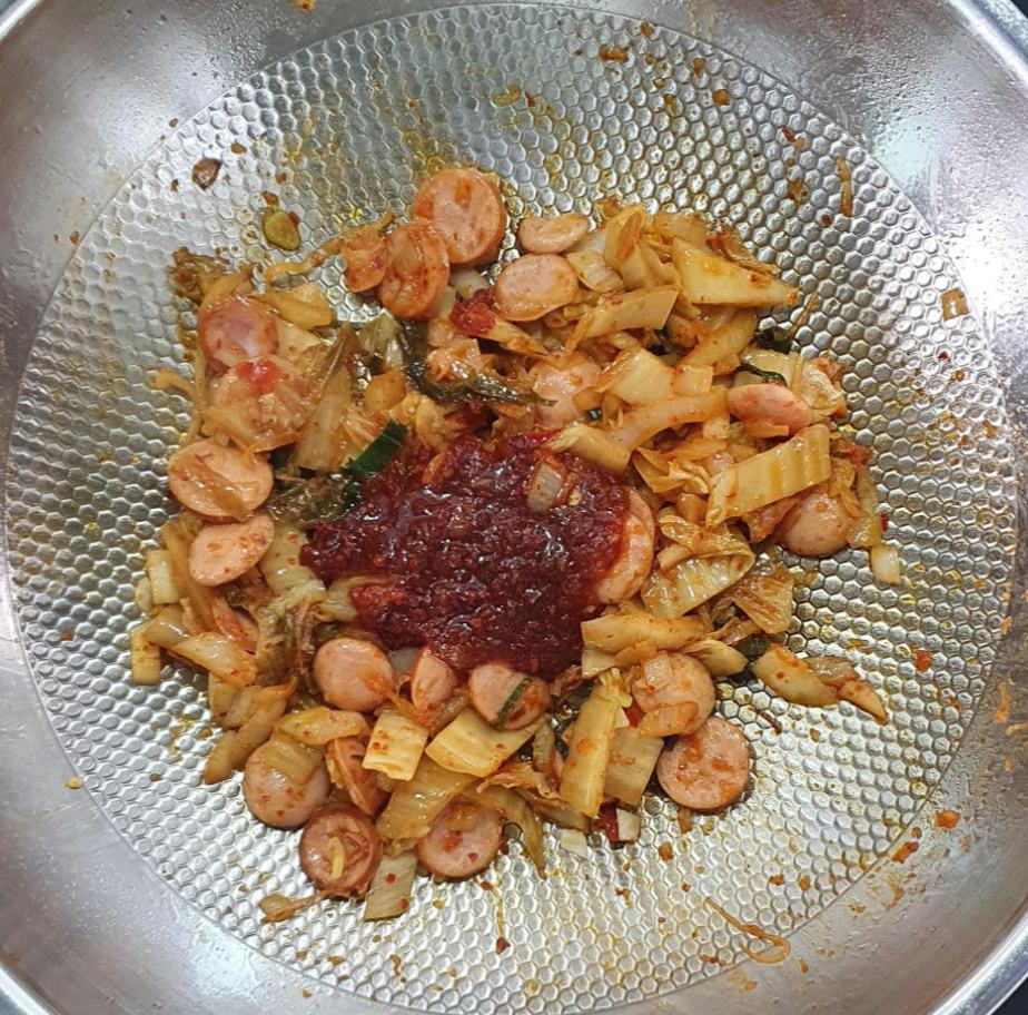 김치를 추가해 주시고, 양념장을 같이 넣어 볶아주기 시작합니다.
