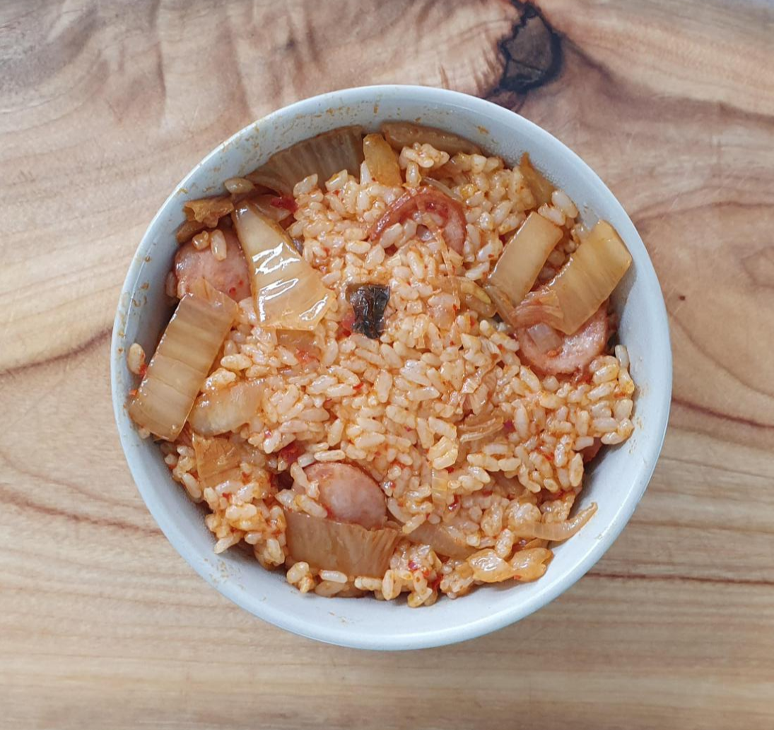특별히 오늘은 소세지를 넣어 씹는 맛을 살리고, 소시지의 풍미와 어우러져 맵지 않은 김치볶음밥 만들어볼게요.