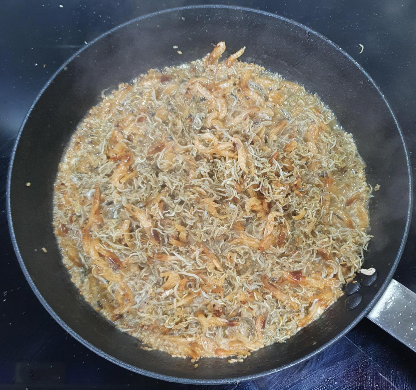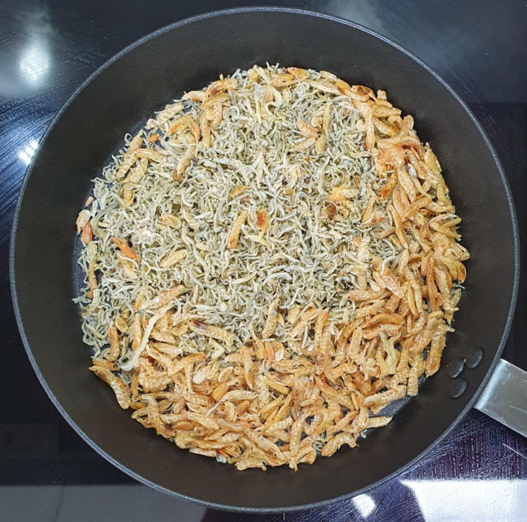 아무것도 넣지 않은 팬을 달궈주신 후, 정량의 멸치와 보리새우를 넣습니다.