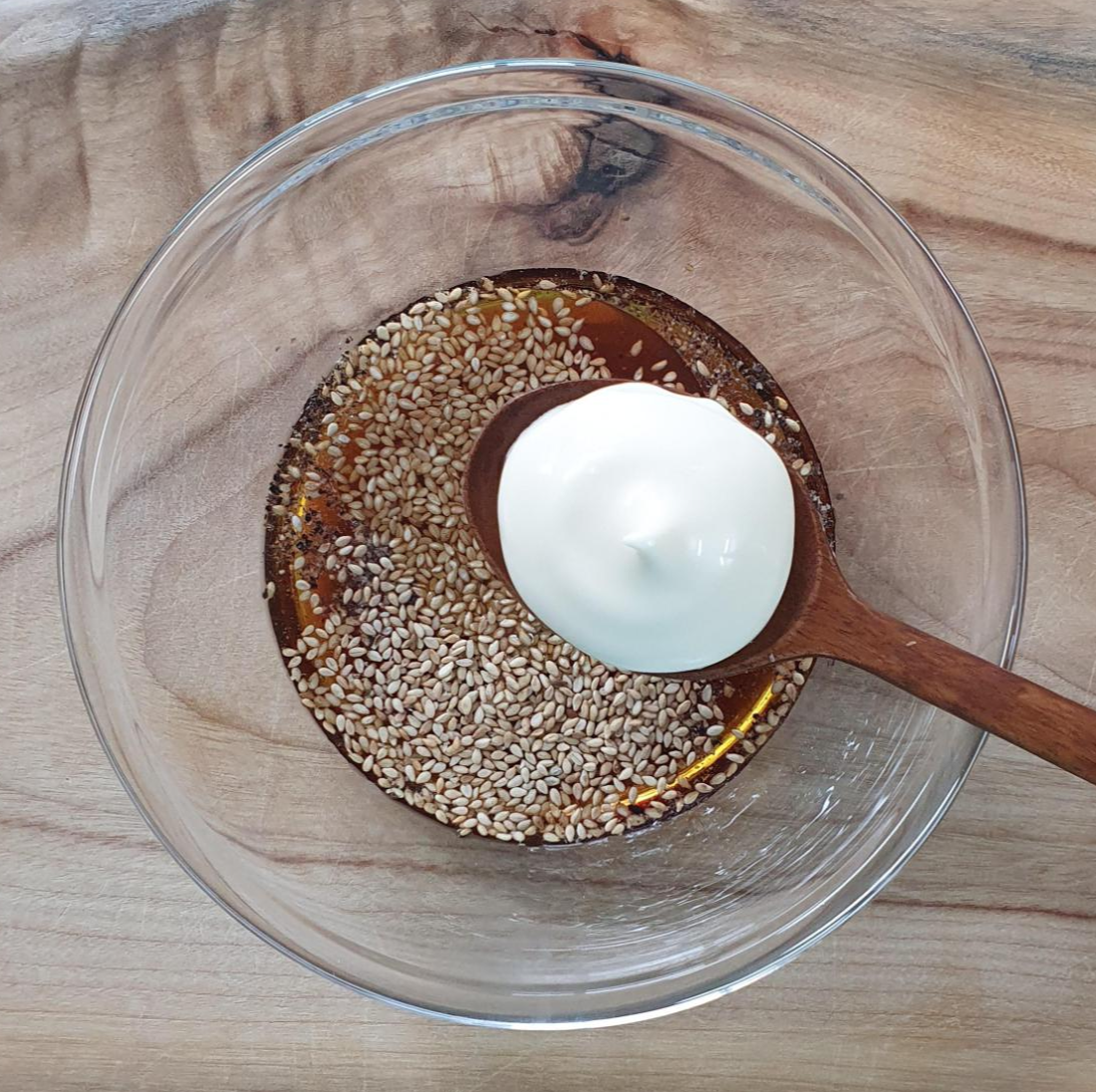 마지막 고소함을 추가하는 양념재료입니다. 참기름 1스푼은 기본으로 넣어 주시고, 통깨도 반 스푼 넣어 주세요.