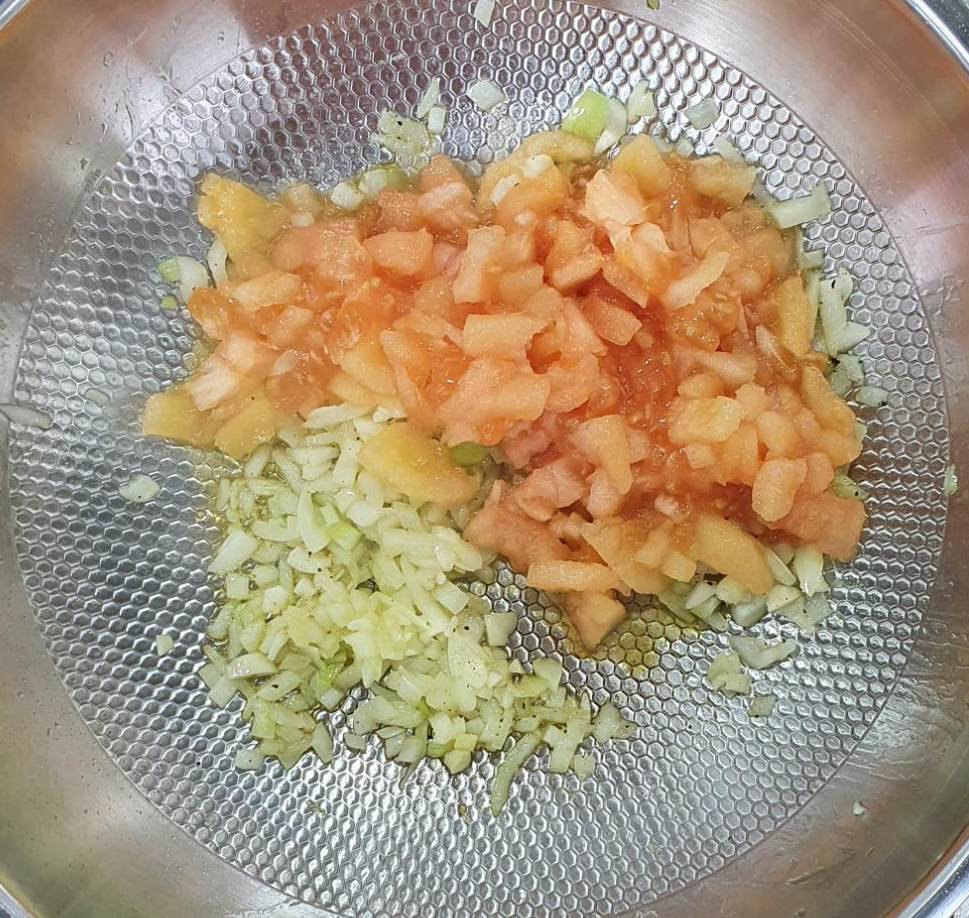 야채들이 어느 정도 볶아졌어요~! 그러면 메인 재료인 토마토를 넣어 주어야겠죠? 잘게 썰어 준비한 토마토를 추가해 줍니다.