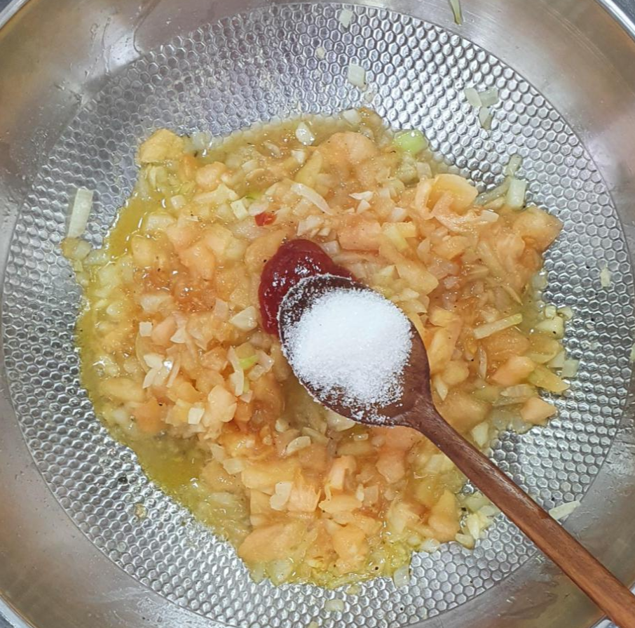 재료들을 잘 섞어서 중불 이하로 익혀주시기 시작하시면 , 토마토케첩을 넣어 주세요.