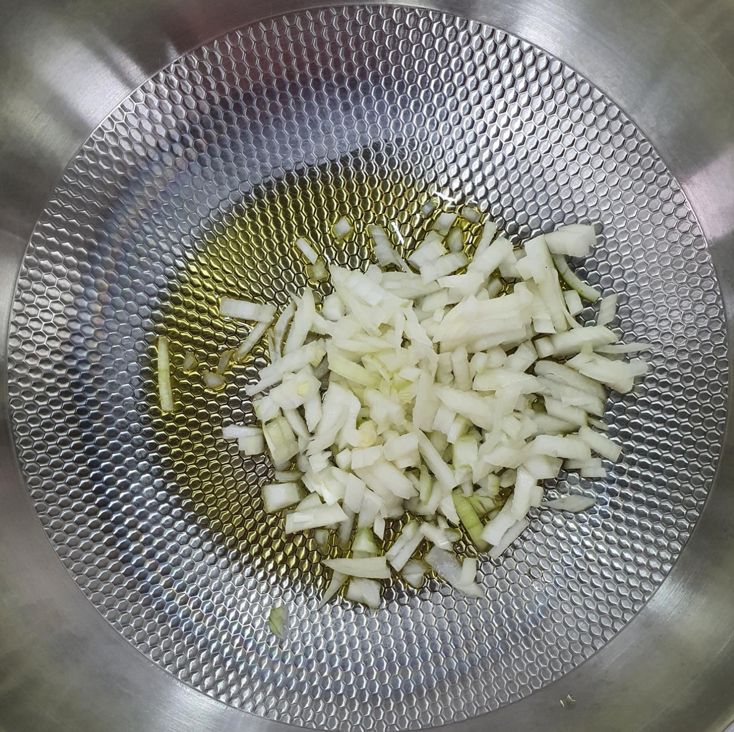 팬 위에 올리브 오일을 두른 뒤, 양파를 넣고 볶아 주기 시작합니다. 투명한 양파가 될 때까지 살살 볶아 주시면 돼요.