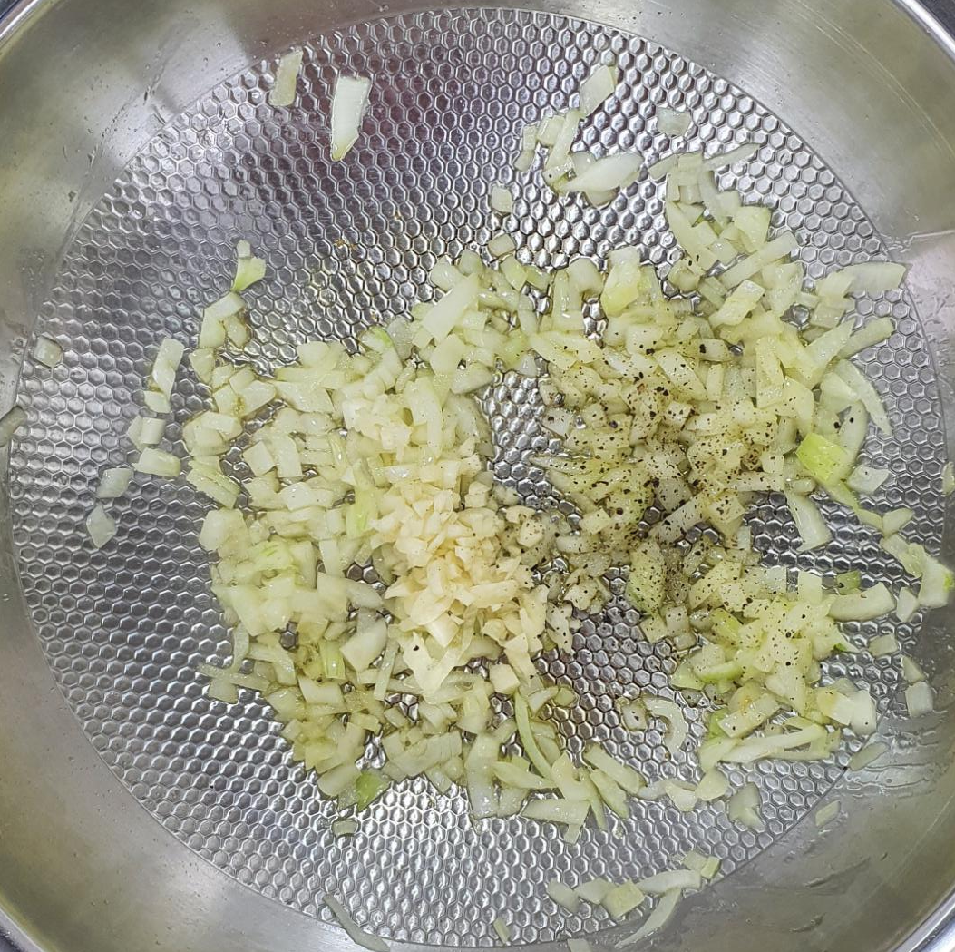 양파가 완전한 투명색이 되기 전에 다진 마늘과 후추를 조금 뿌려줍니다. 다진 마늘을 넣으신 다음에는 불을 중간 불로 줄여주시면서 볶아주세요.