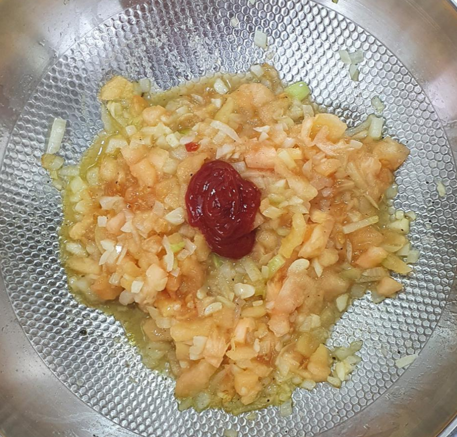 타지 않는 불로 뚜껑을 덮어 수분 날아가는 것을 차단했다는 점 참고해주시고, 다양한 재료를 넣어가면서 계속적으로 토마토를 으깨주셨으면 좋겠습니다.