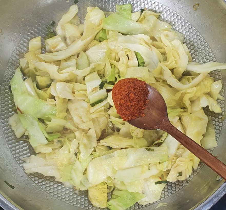 여기서 중요한 점은, 고춧가루만 넣은 상태에서 볶아지고 있는 양배추를 드셔 보세요. 치킨스톡으로만 맛을 내도 양배추의 단맛이 받쳐주기에 기본 맛은 좋습니다.