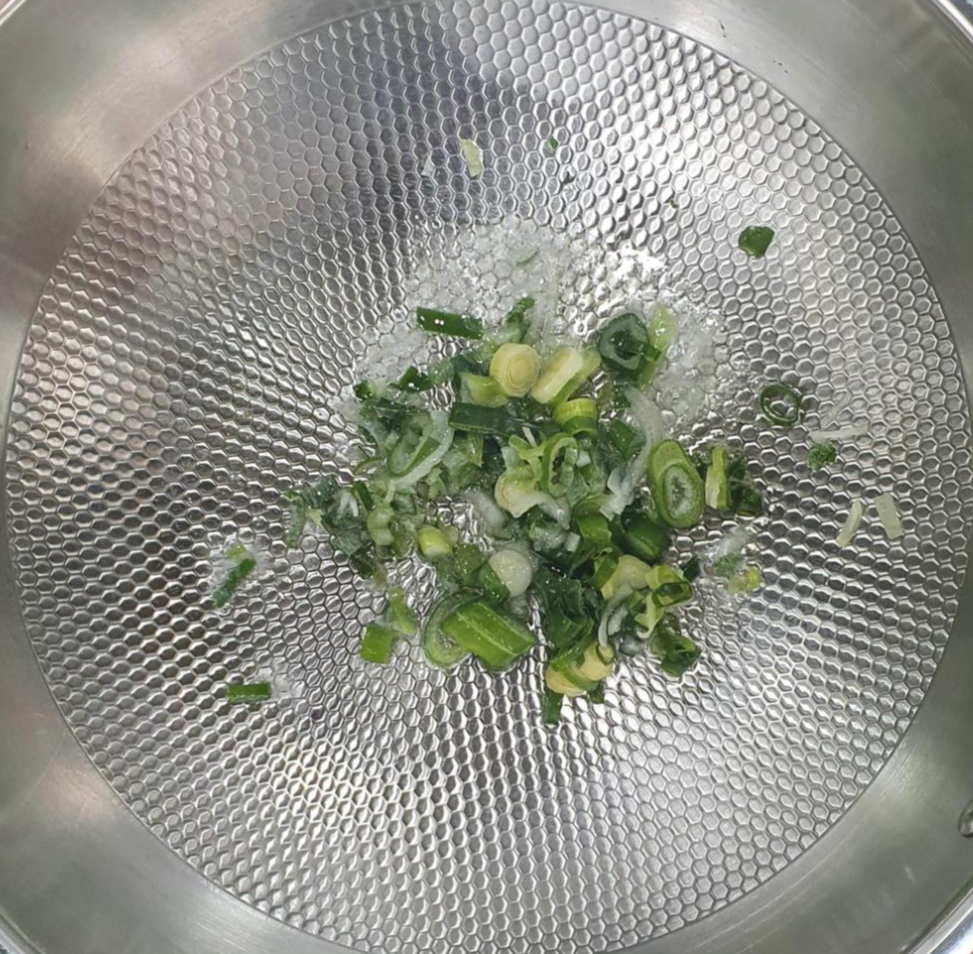 팬에 기름을 좀 둘러 주시고 파를 먼저 볶아 줍니다. 파를 볶으시면서 준비해야 할 것이 있어요.