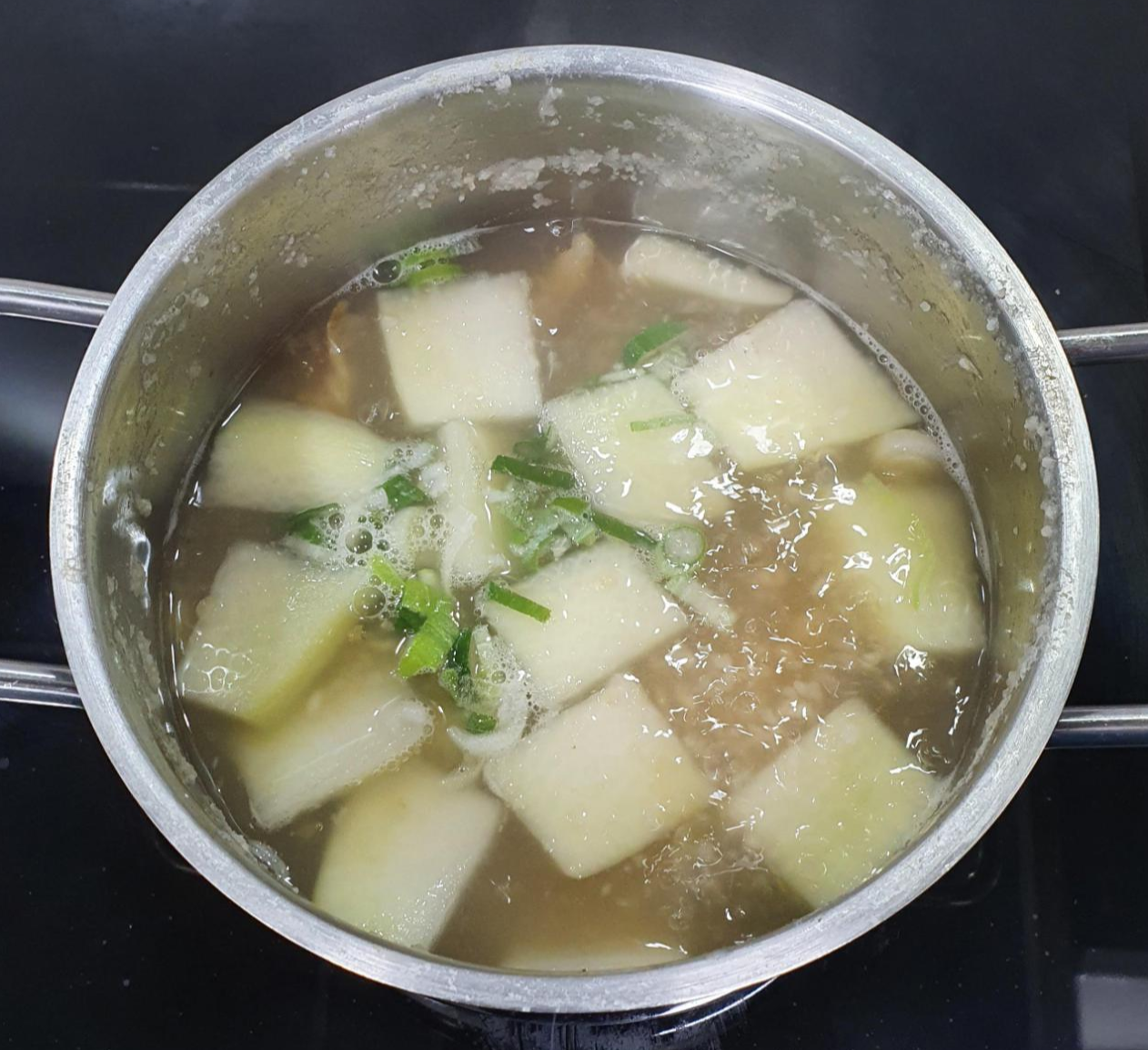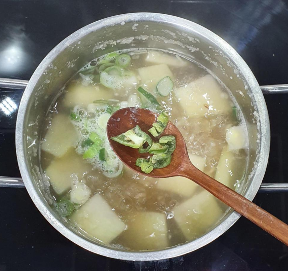 거진 마무리가 되어가는 순간이 찾아오면, 대파를 넣어 주세요. 위에 재료손질에서 설명드리진 않았지만, 청양고추 약간 넣어서 칼칼한 맛을 추가 했습니다.