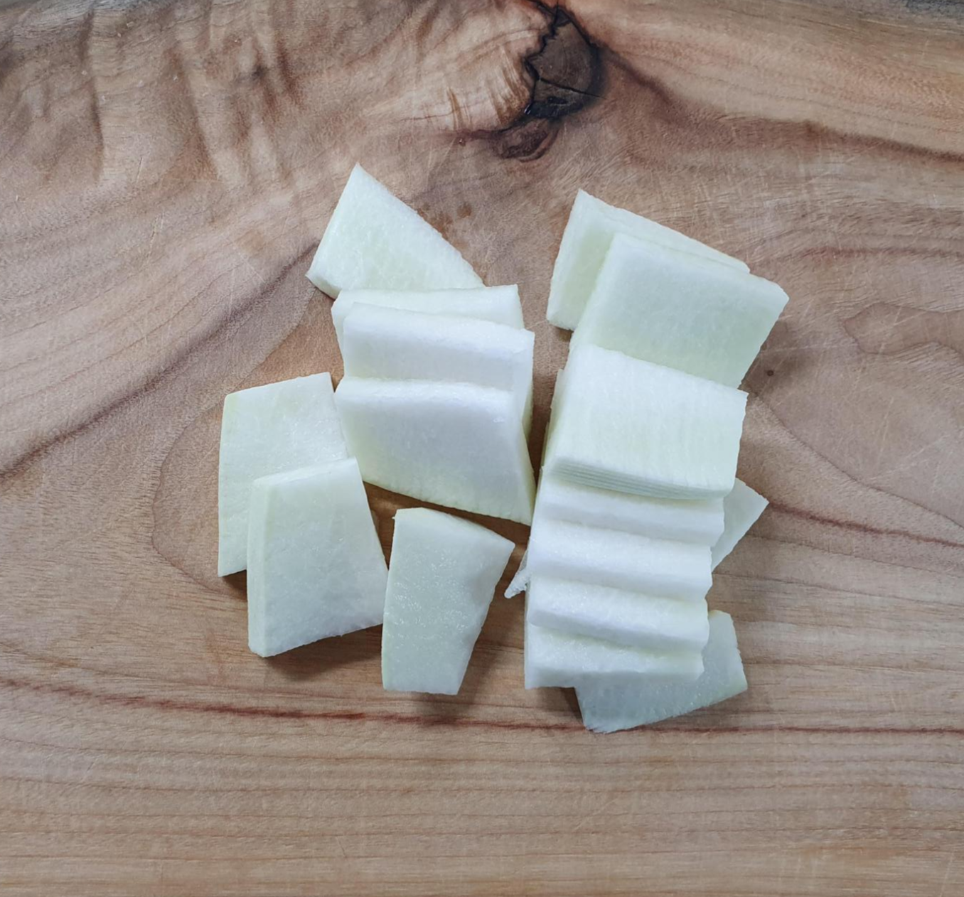 소화에 도움되는 천연 재료. 무를 준비해 주실 차례입니다. 나박 썰기를 하셔서 적당한 크기로 썰어주시면 좋을 것 같아요.