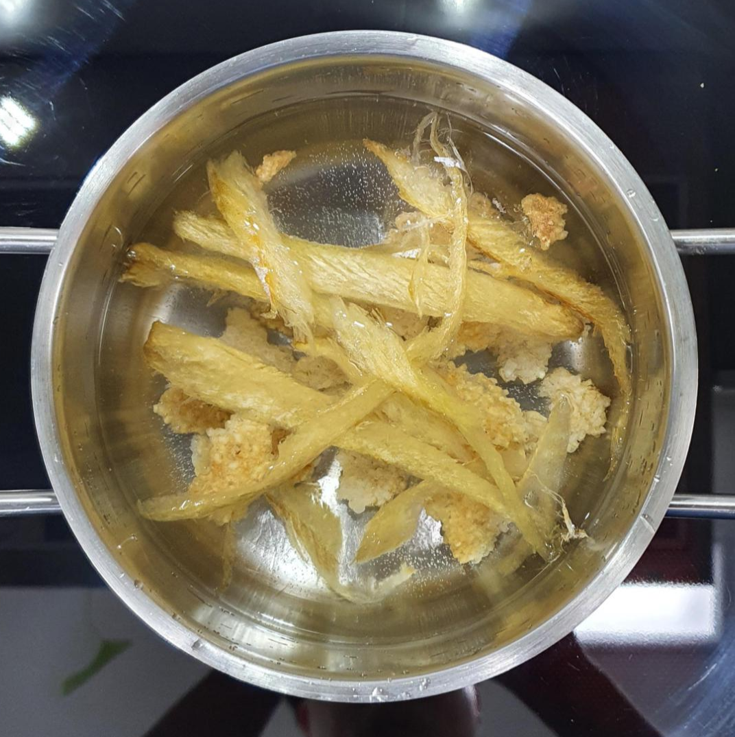 누룽지를 끓이기 시작할 때 황태채를 같이 넣어 줍니다. 누룽지가 끓여지고, 황태채의 시원한 맛이 육수에 배이도록 말이죠. 같이 끓이기 시작하면 황태는 더욱 부들부들한 식감을 선사할꺼에요.