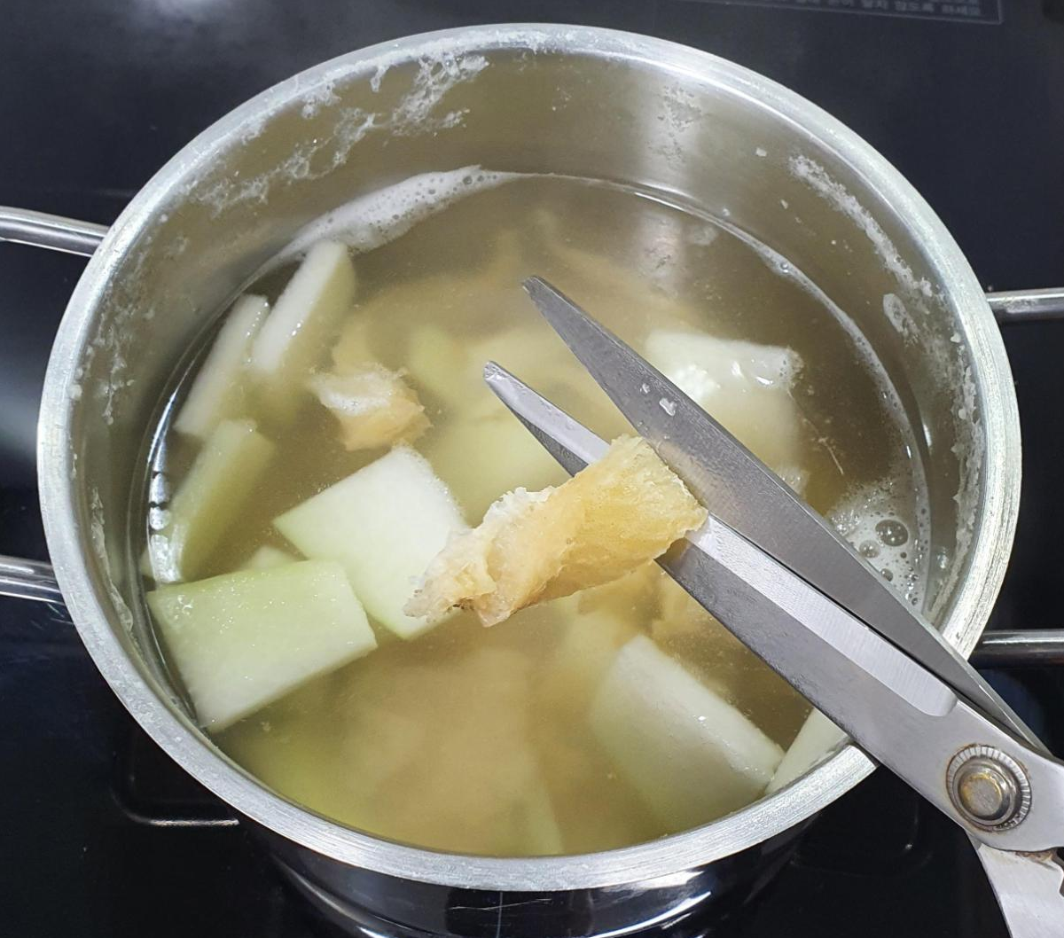 팔팔 끓어 오르는 모습을 지켜보시게 되면 황태가 부들부들해지는 때가 옵니다. 그떄 황태를 먹기좋은 크기로 잘라주시는데 가위를 가지고 잘라주시면 되겠습니다.