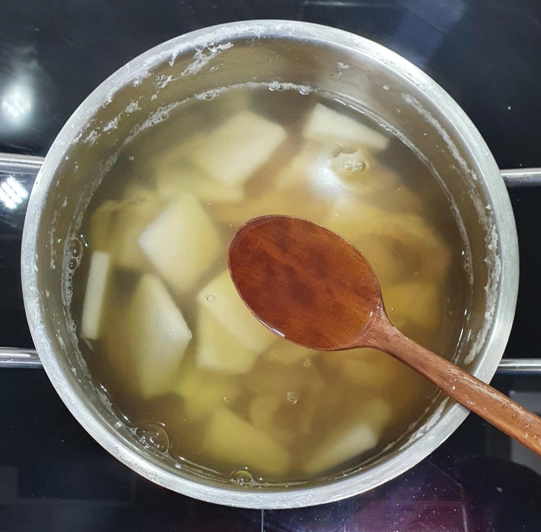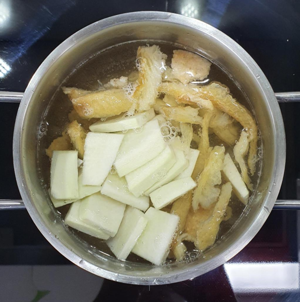 황태를 넣고 물이 끓어오르기 시작한다면, 그때 준비했던 나박 썰은 무를 넣어 줍니다.