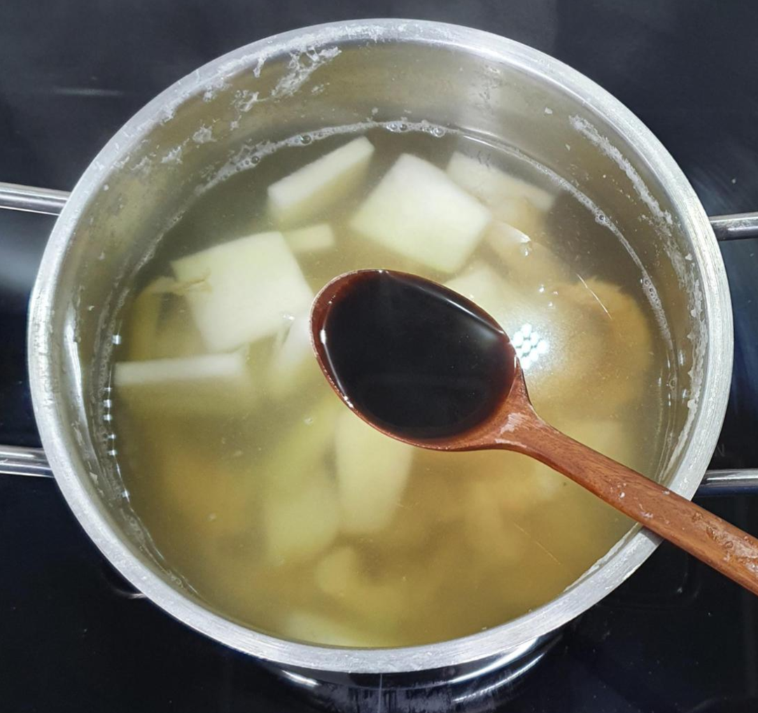 둘다 딱 1스푼씩만 넣고 더이상은 넣지 않는 것을 추천해요. 만약 국간장을 더 넣게 되면 국물이 탁한 색으로 변하고, 참치액을 더 넣으면 참치액 맛이 너무 강해지기 때문에 전체적인 맛의 벨런스가 깨지기 쉽습니다.