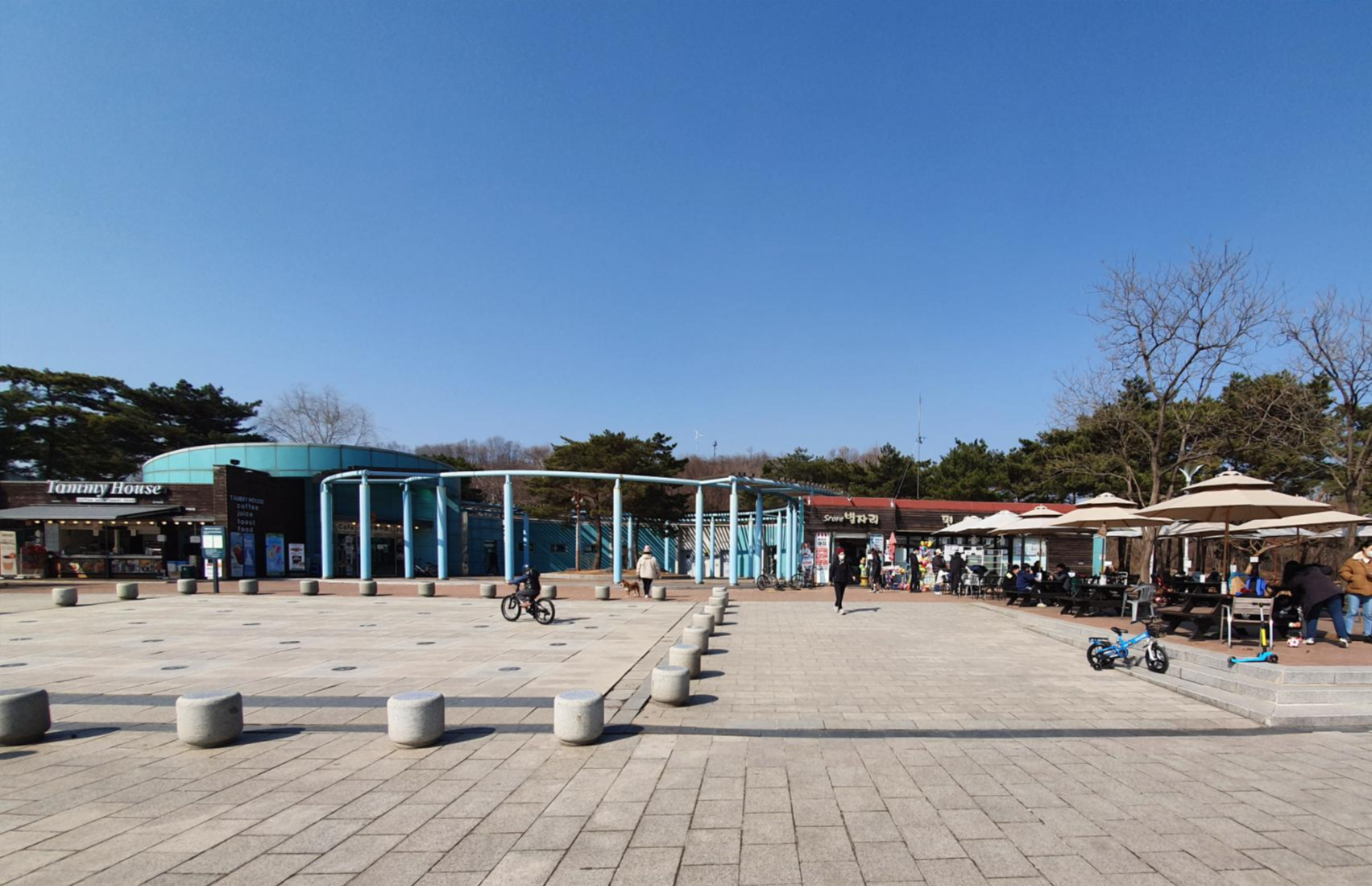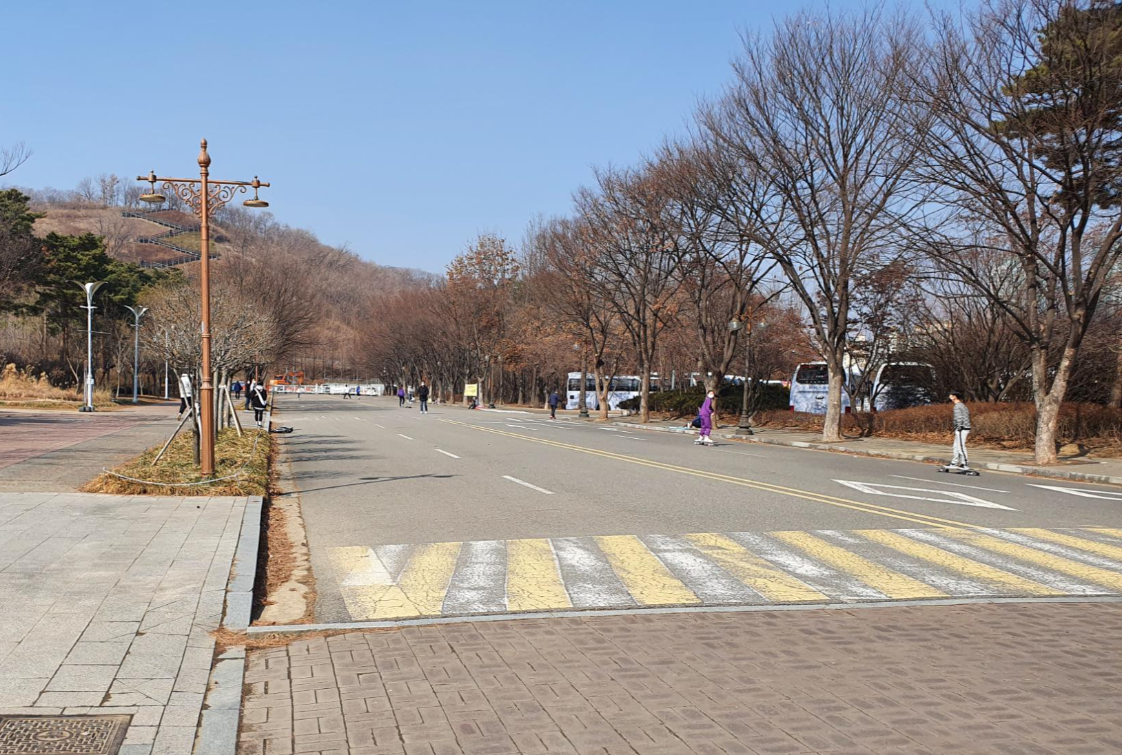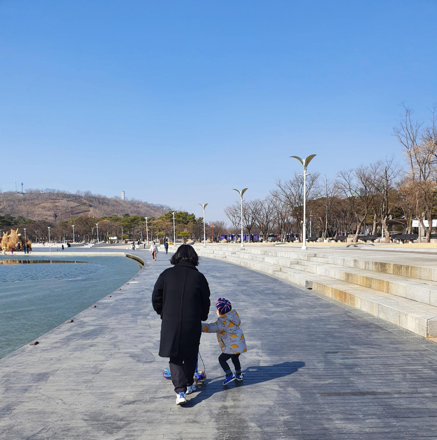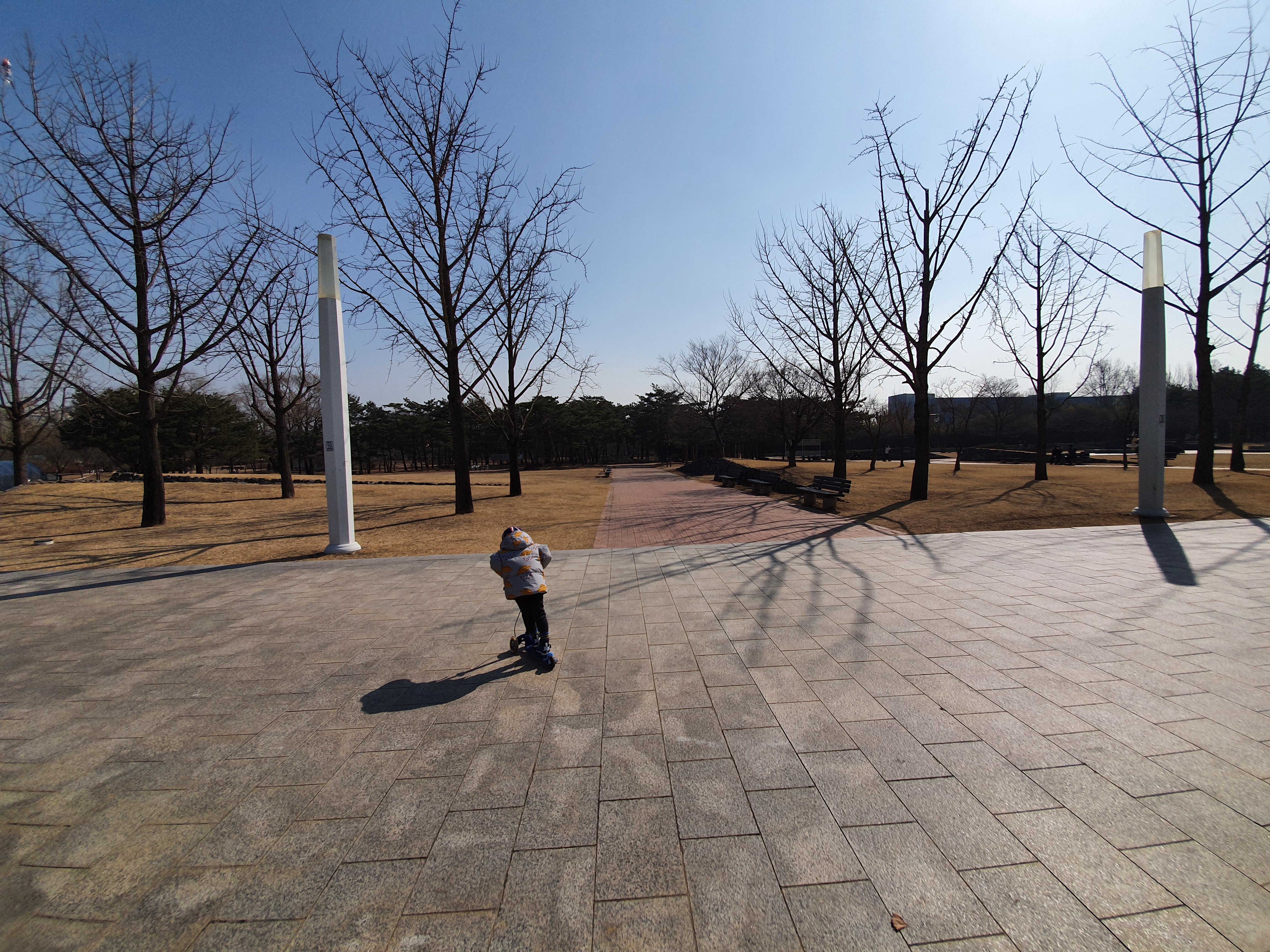 저멀리 아이가 킥보드타고 신나게 달려가는 모습~ 길도 크고 방문객도 적어서 안전하게 탈 수 있네요.^^