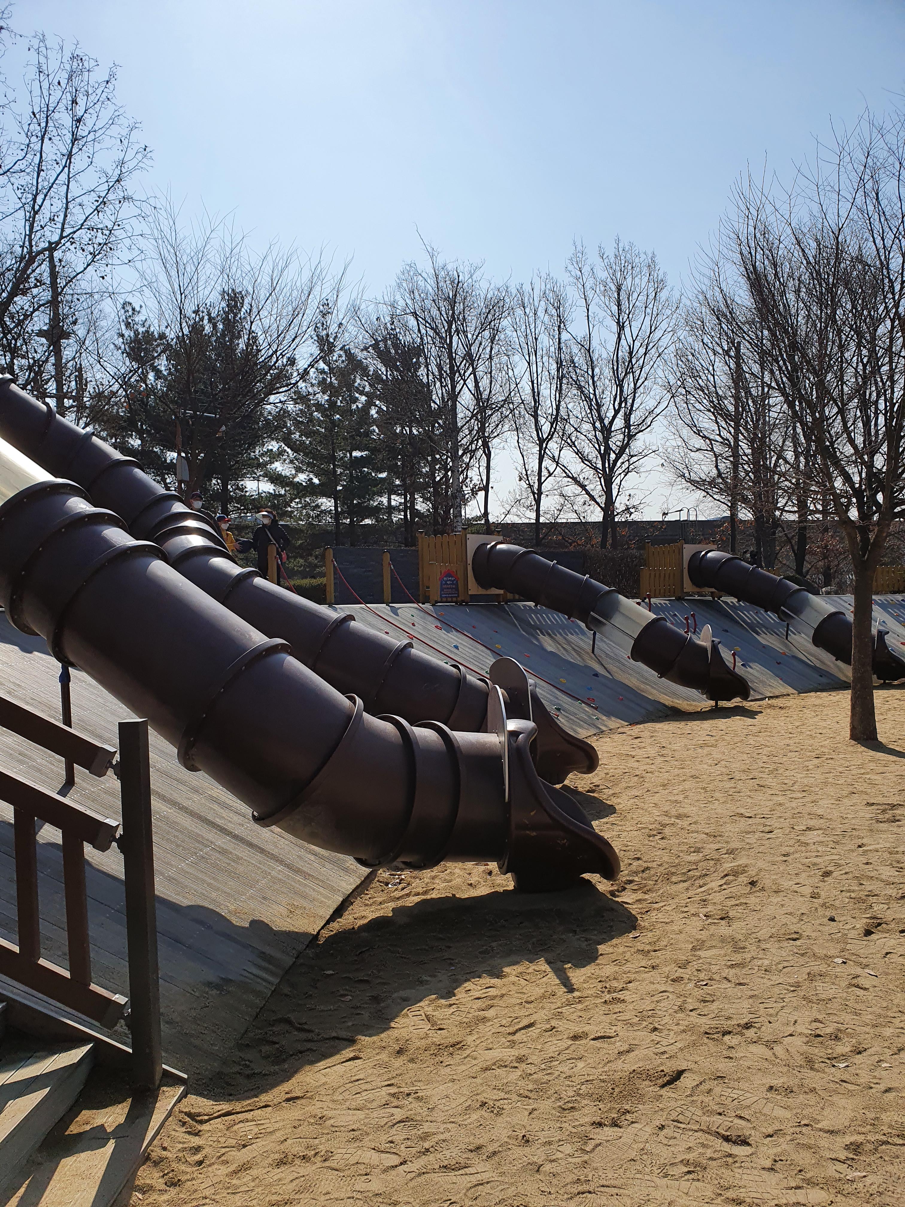 미끄럼틀은 길게 뻗어있는 미끄럼틀 2개와 짧은길이로 뻗어있는 미끄럼틀 2개로 구성이되어 총 4개의 미끄럼틀이 있어요.