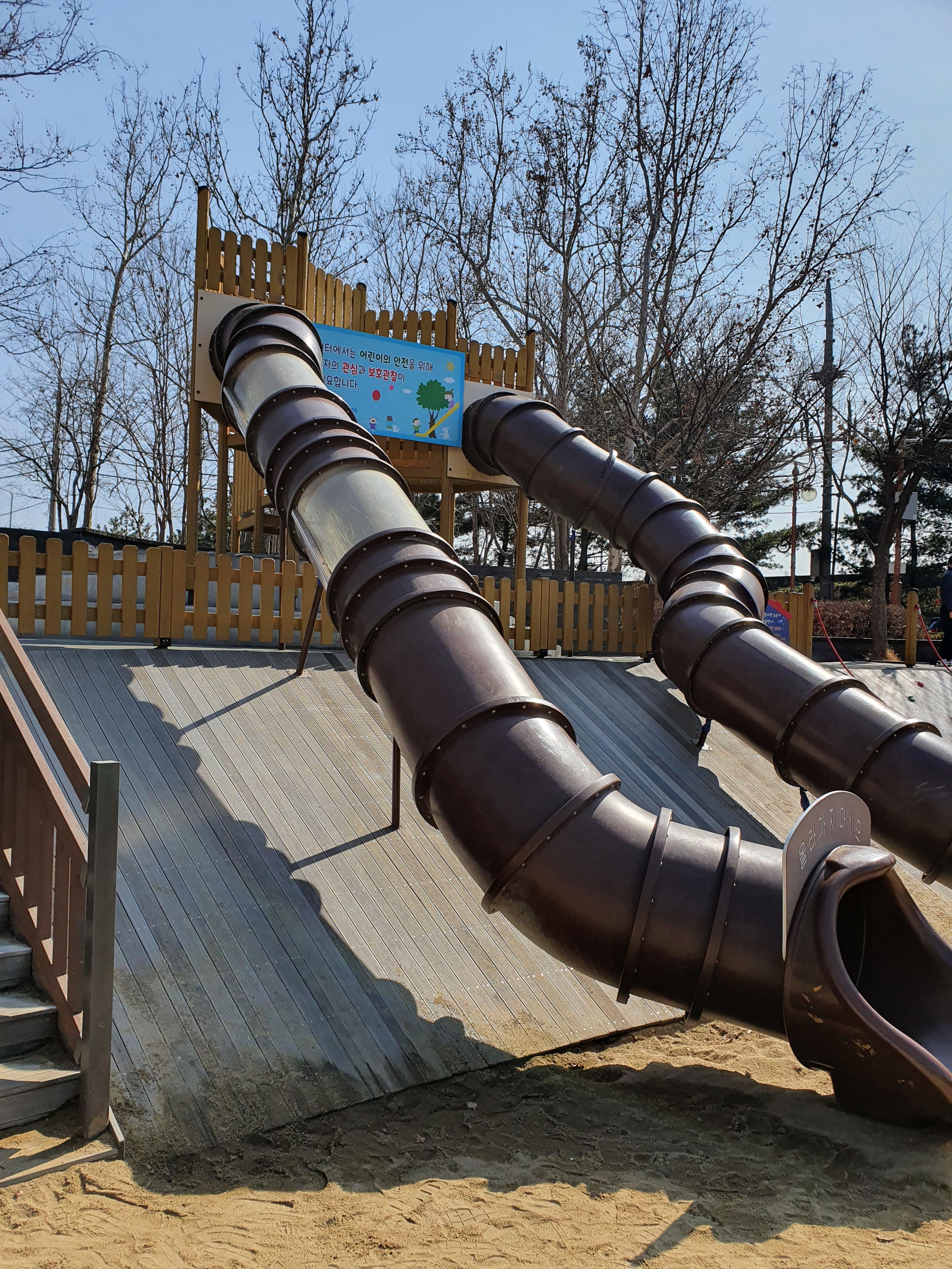 나무로 많든 장애물을 건널 수 있도록 한 놀이시설이 많습니다. 그래서 이름을 모험 놀이터로 지었는지, 딱 알 수 있곘더라구요. 저희 아이가 놀 수 있는 것은 작은 미끄럼틀 정도 여서 미끄럼틀로 가보았네요~