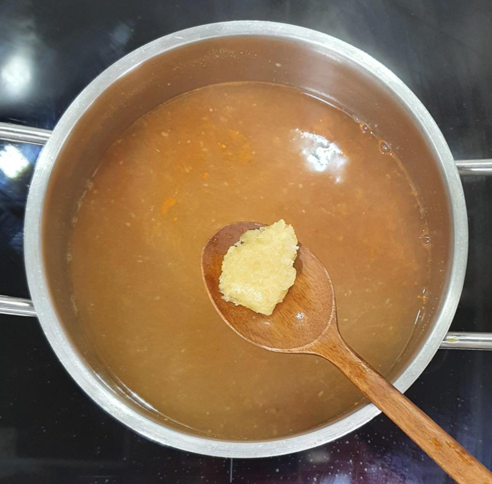 고추장을 넣으면 텁텁한 맛이 날 수 있으니 고춧가루를 사용해주시면 좋겠어요. 또한, 된장의 간이 집집마다 가지고 있는 된장이 다르기에 적정량을 넣어 주시면 좋겠습니다.