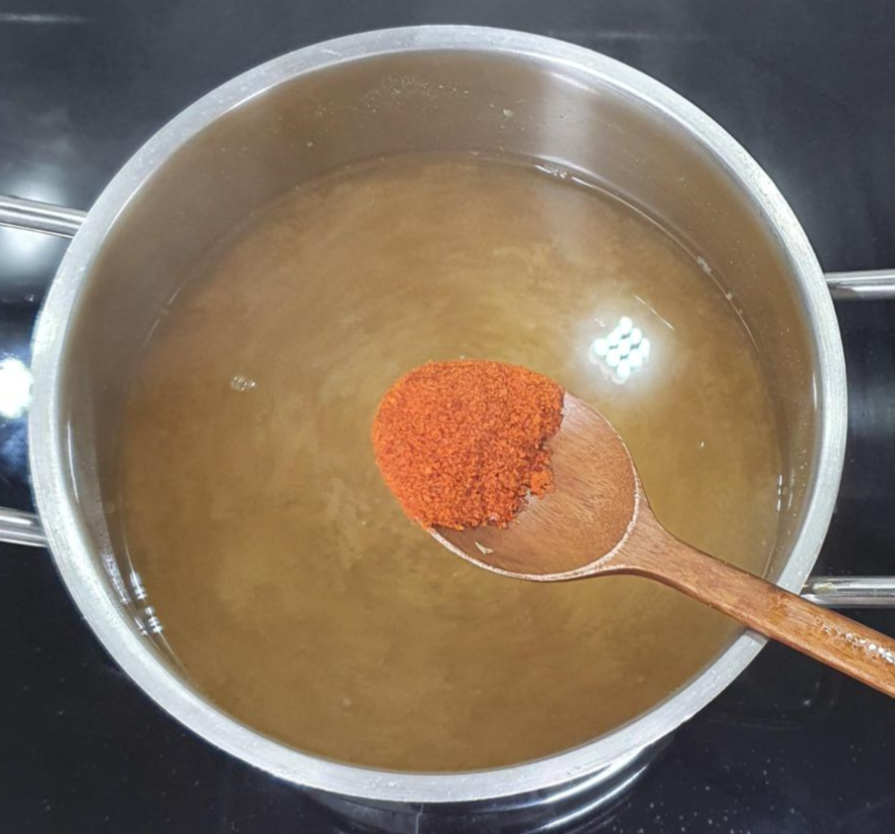 이제 된장을 넣어야 합니다. 된장을 1스푼 넣어주고, 깔끔한 맛을 위해 고춧가루 반 스푼 정도 추가해 줍니다.