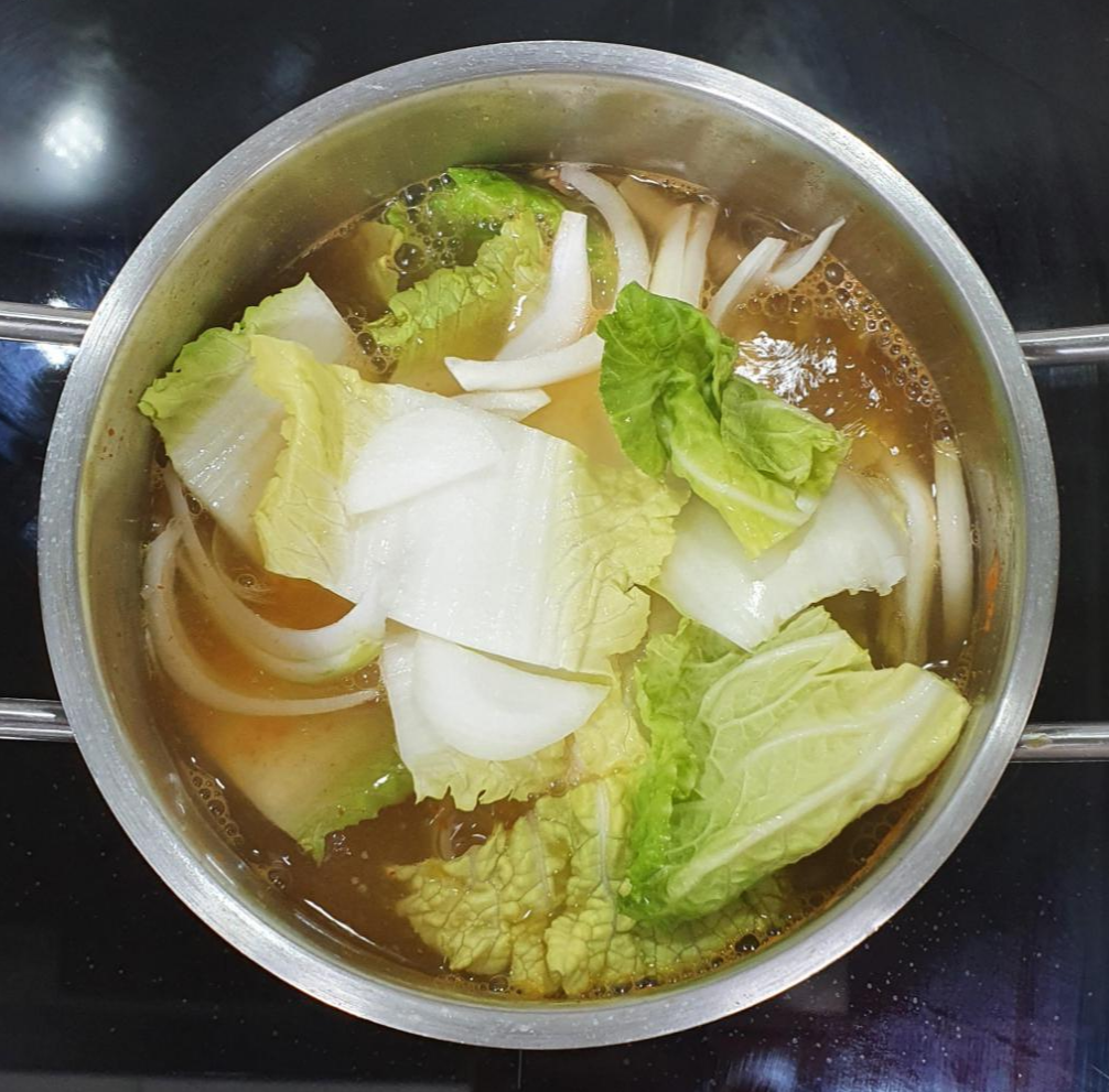 베이스로 만들어 놓은 육수가 끓어오를 때 준비된 배추와 양파를 동시에 넣어 주었습니다.