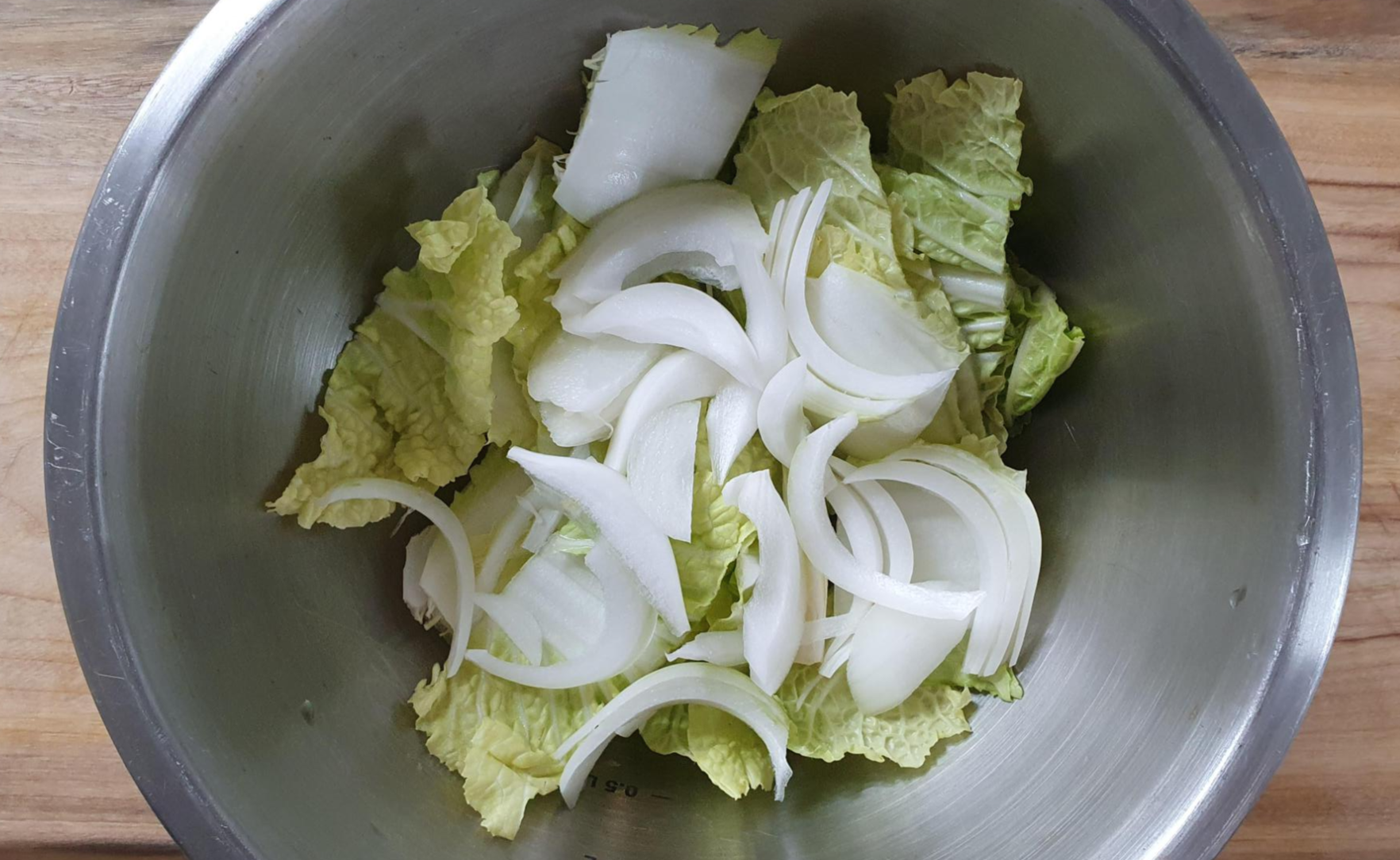 미리 썰어두었던 배추, 양파를 한 곳에 모아서 한 번에 넣어줄 준비를 해주세요.
