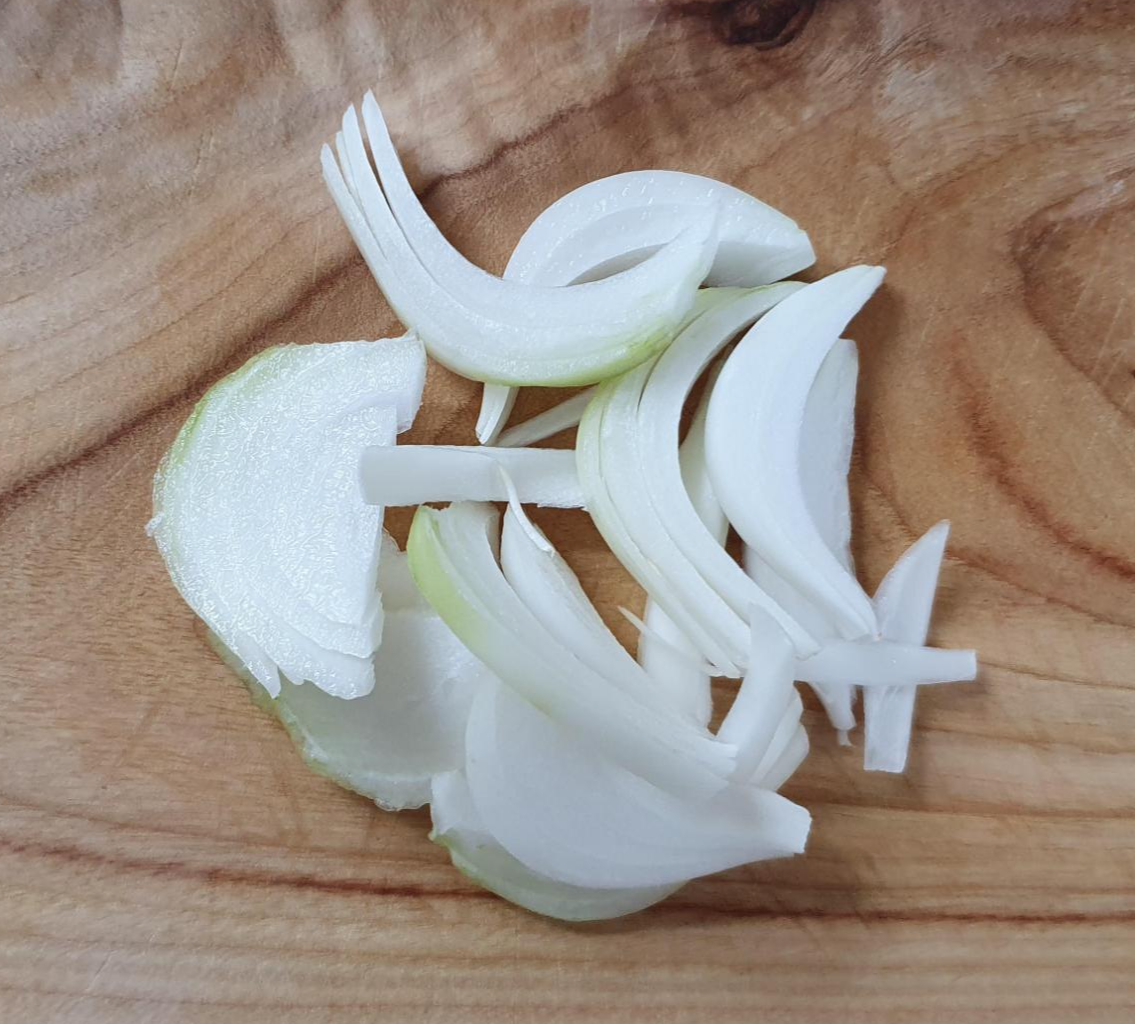 양파도 채썰어 준비해 주시면 좋겠어요. 양파는 너무 얇지 않고 적당한 두께감 있게 썰어서 준비해 주시면 됩니다.