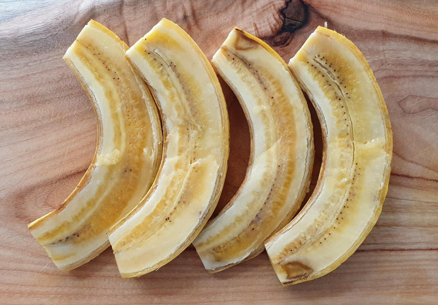 잘 익어진 바나나를 반으로 잘라서 준비해 주었습니다. 껍질 그대로를 잘라 주었다는 점 참고해 주세요.
