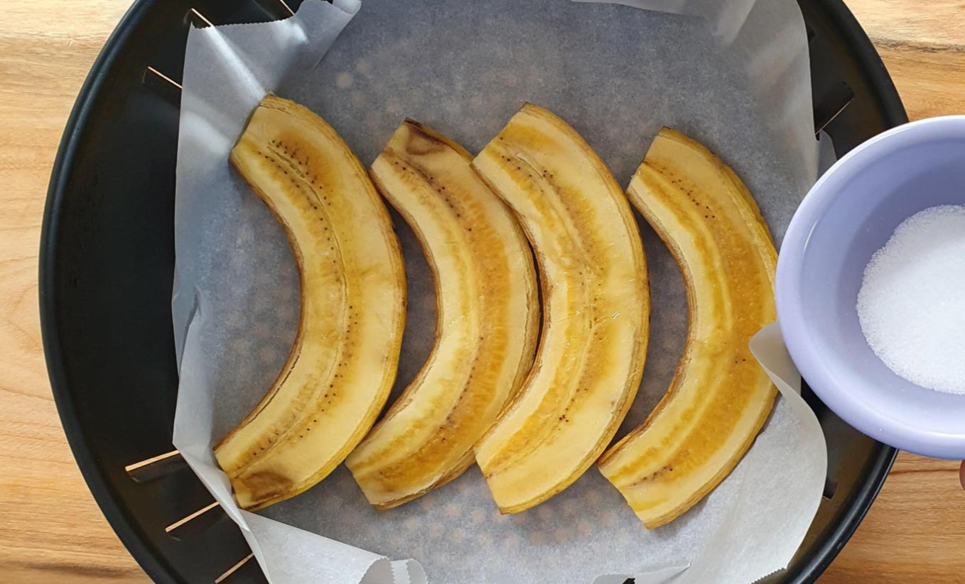 바나나위에 버터를 바르고 난 뒤에 설탕을 조금 부려 줄 것입니다. 에어 프라이기에 담아 놓은 상태에서 설탕을 솔솔 뿌려 주시면 되겠습니다.
