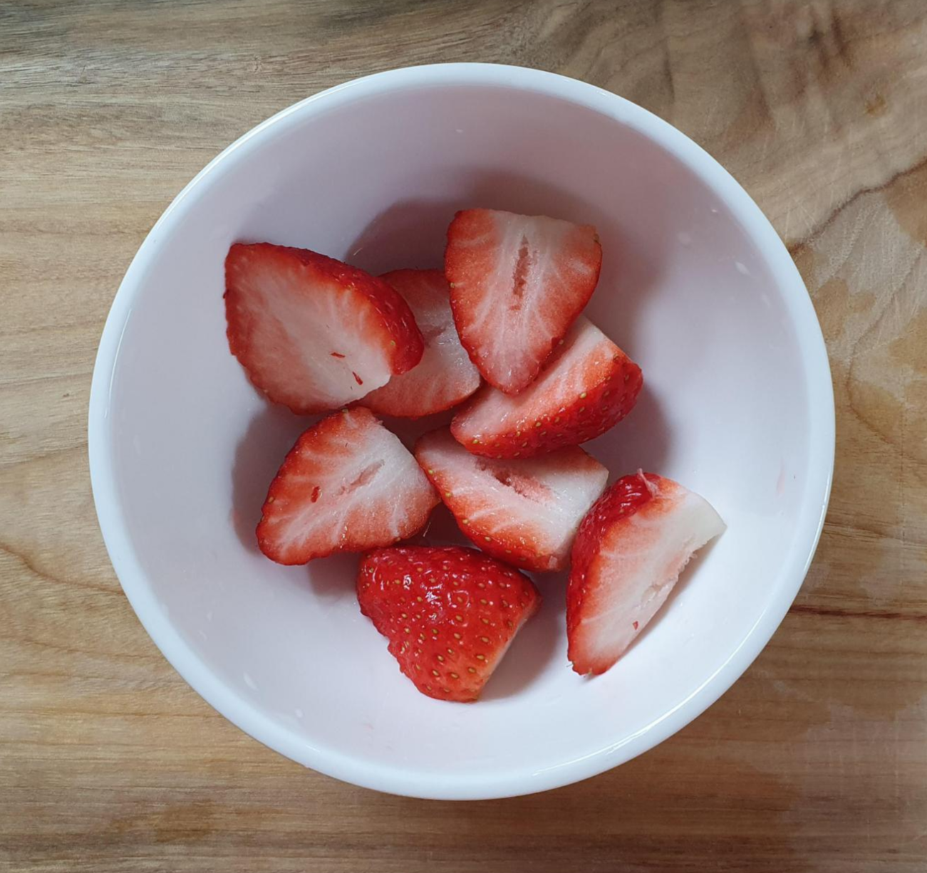 깨끗하게 흐르는 물로 씻은 딸기는 꼭지를 제거한 후에 먹기좋은 크기로 썰어서 준비해 주시면 좋겠네요. 이제 모든 재료 준비는 끝이 나고 드레싱 만들러 GO GO.