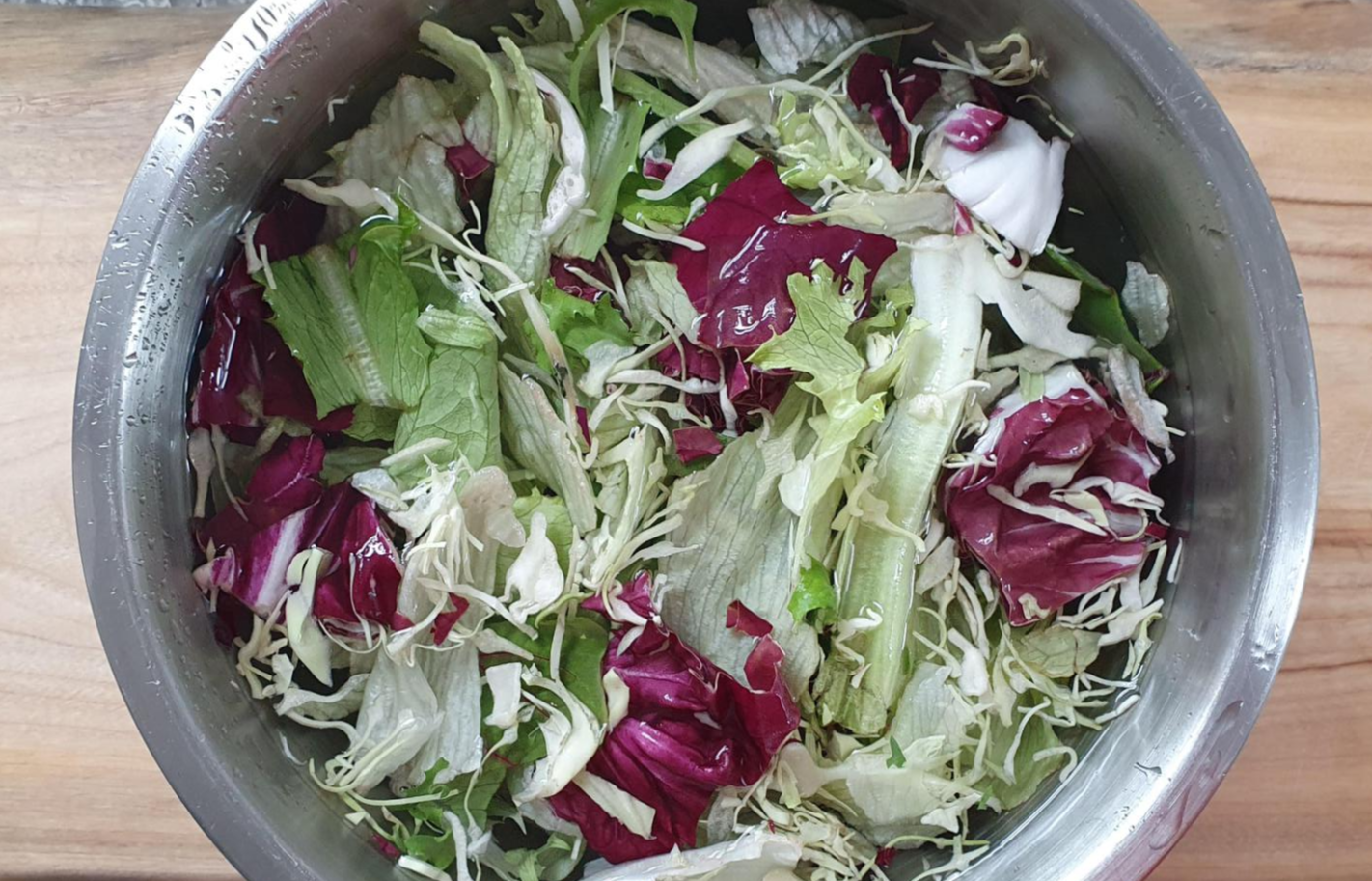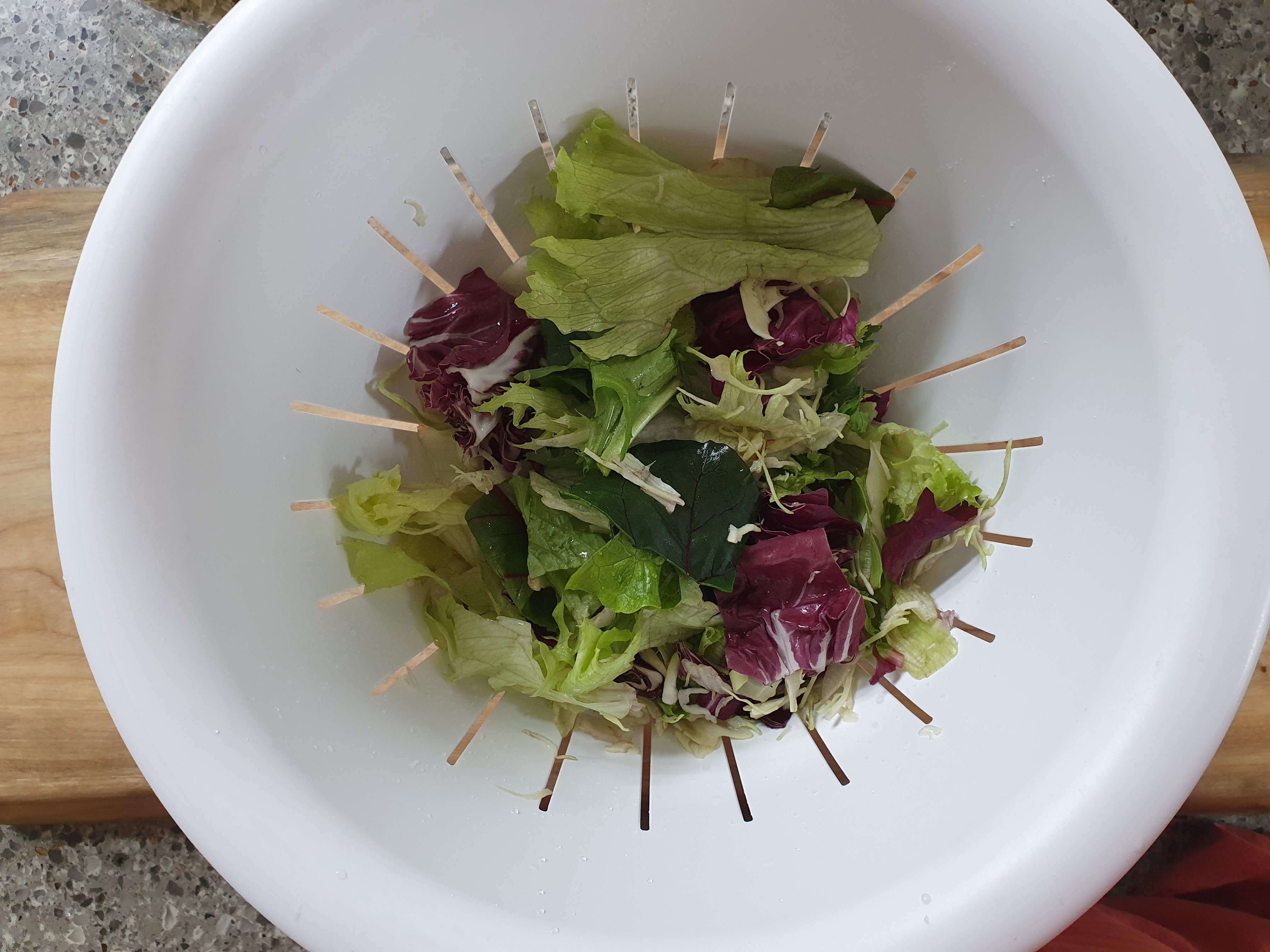 사실 이제 거진 다 끝났다고 보시면 되겠어요. 샐러드를 담을 이쁜 그릇을 준비하셔서 물기가 제거된 샐러드 야채를 올려주시기 바랍니다.