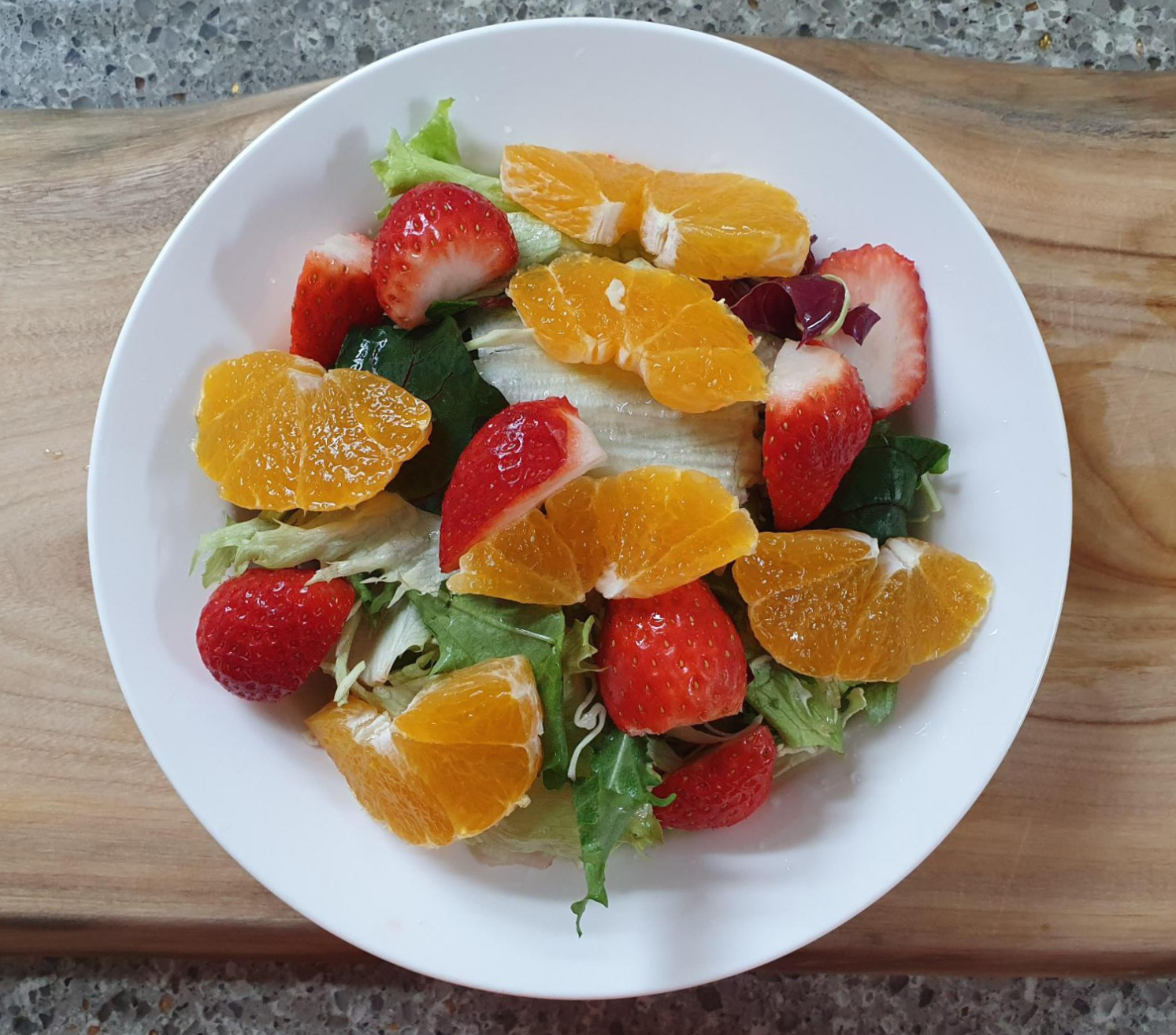 야채와 한라봉, 딸기까지 올려 주시면 모든 샐러드 만들기 과정은 끝이 납니다. 소스와 같이 플레이팅 해주시면 됩니다.