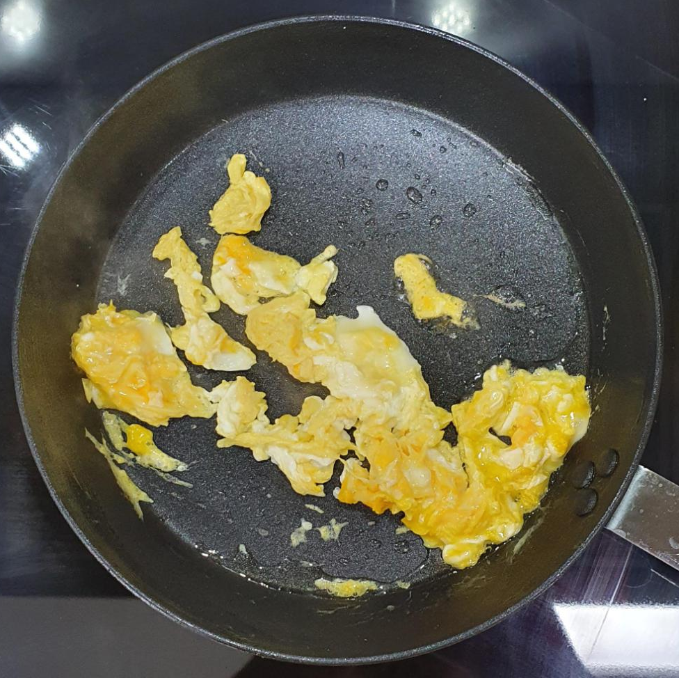마지막으로 준비할 재료는 계란입니다. 계란 1개를 스크램블로 만들어 준비하여 주시면 됩니다. 기호에 따라 2개 사용하셔도 전혀 문제는 없습니다. 참고해 주세요.