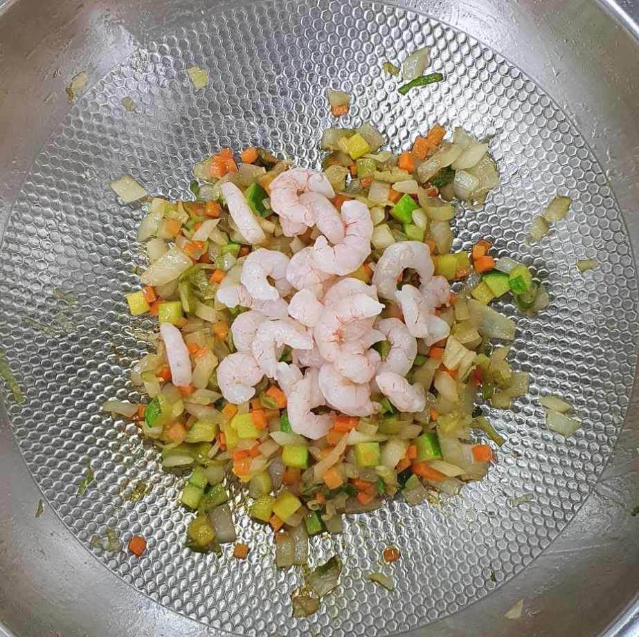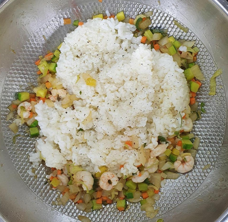 자 이제 볶음밥 야채 및 새우가 다 볶아 졌네요~ 그러면 적당량의 밥을 추가해 주세요. 저는 1.5공기 정도 사용했습니다.