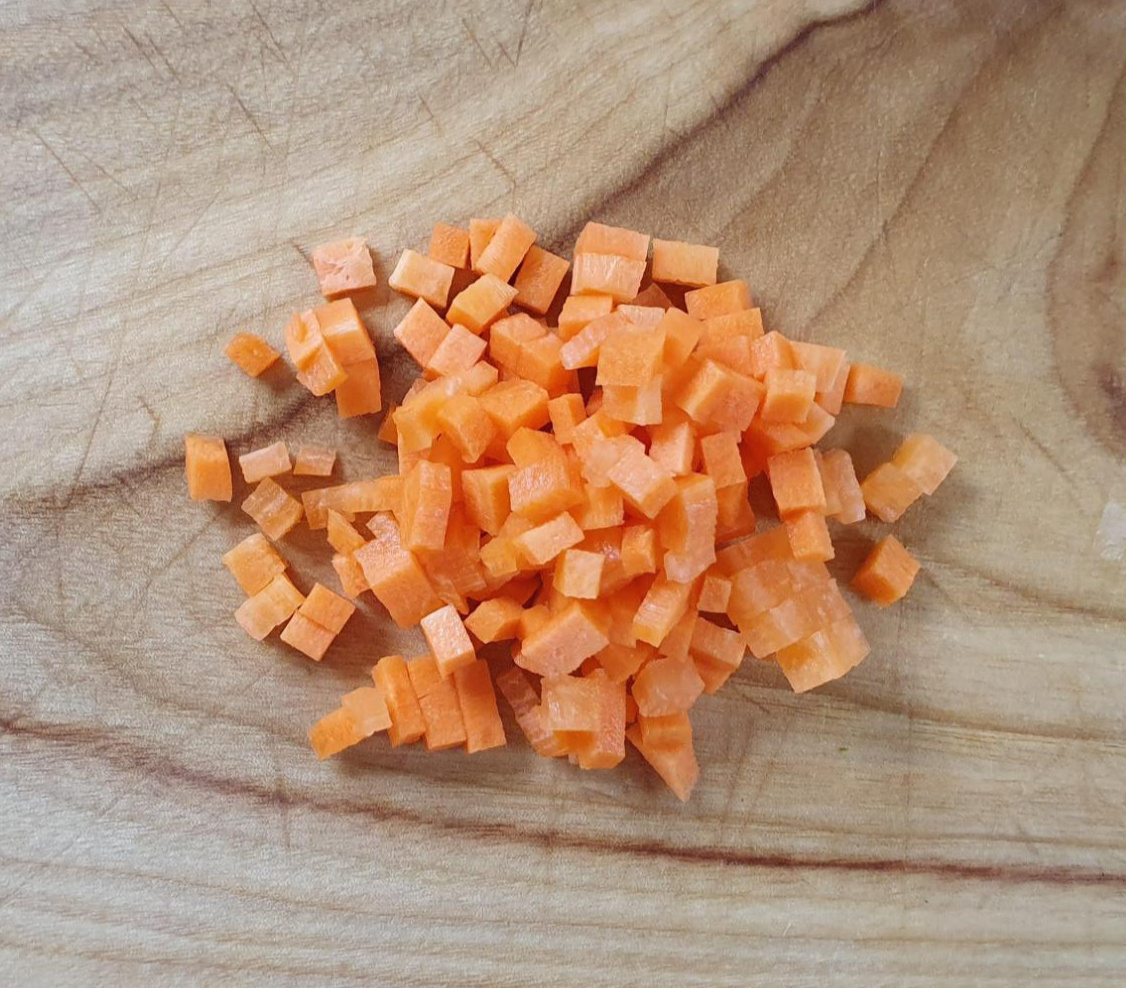 다음은 당근이 들어가야 볶음밥의 색이 이쁘죠? 당근을 소량 준비해서 잘게 다져 준비해 주세요.