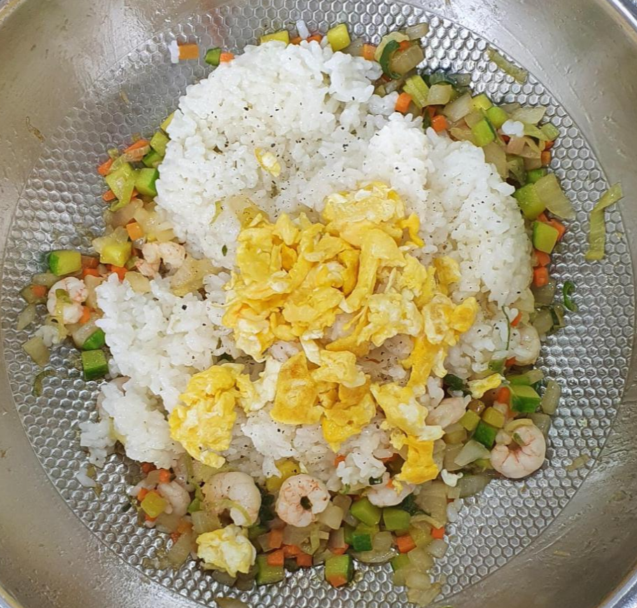 적당량의 소금 및 후추를 밥에 간 하여 주셨다면 동시에 준비했던 스크램블을 추가하여 같이 볶아 주기 시작합니다.