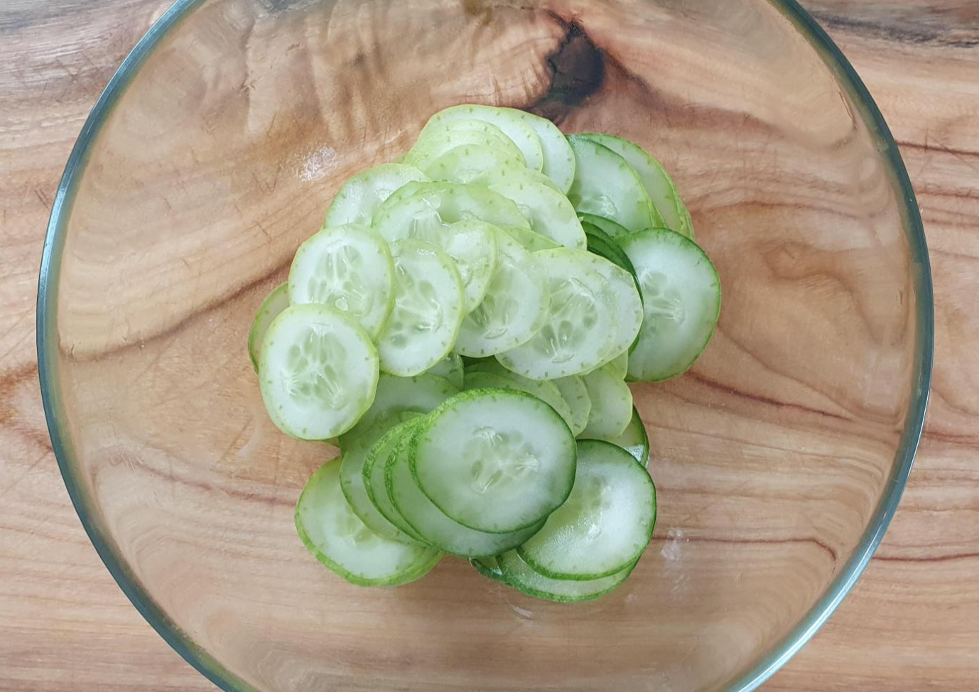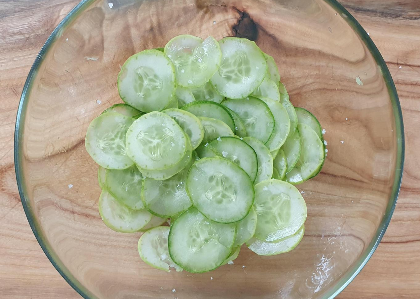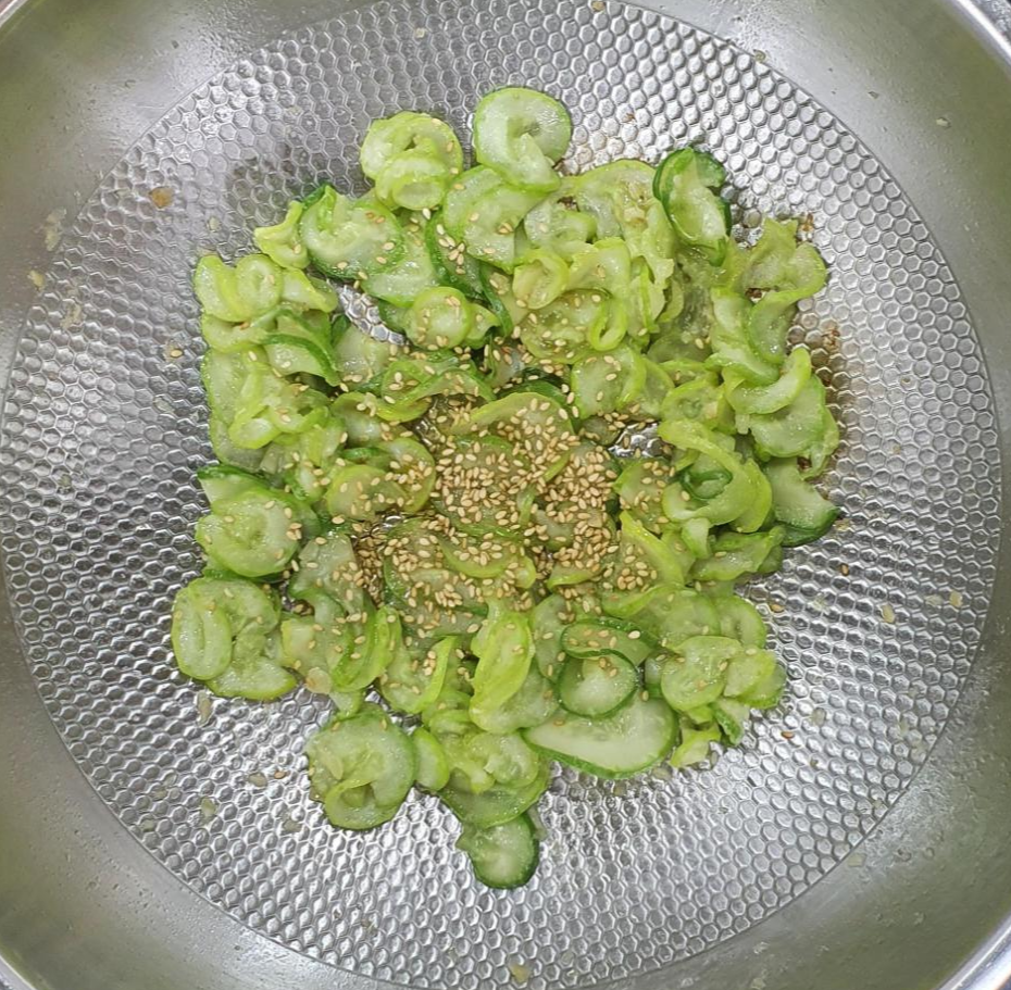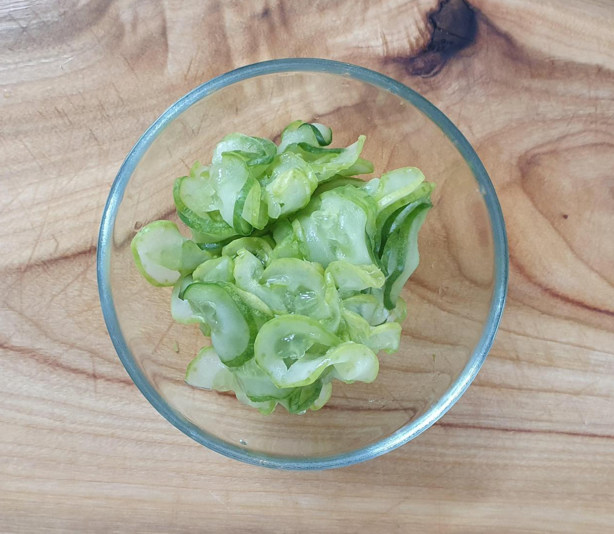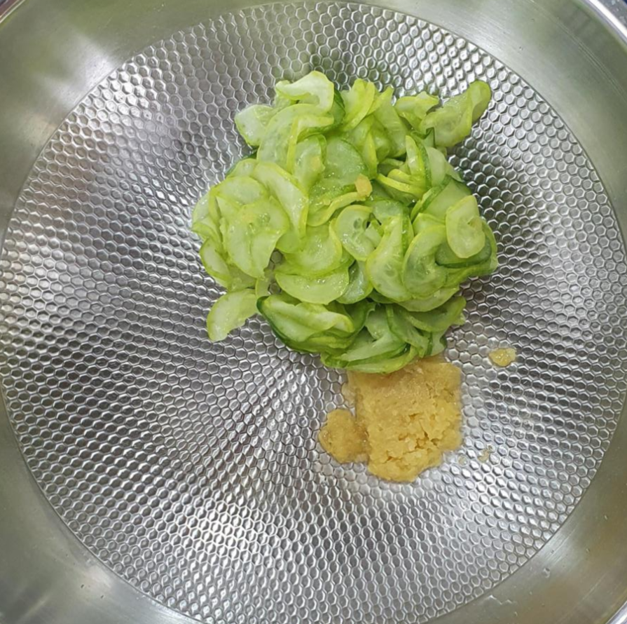 여기서 중요한 점은 소금에 절인 오이를 물에 씻어서 짠맛을 없애는 것은 하지 마시고, 소금에 절여진 물만 모두 제거한다라는 생각을 가지시면 돼요.