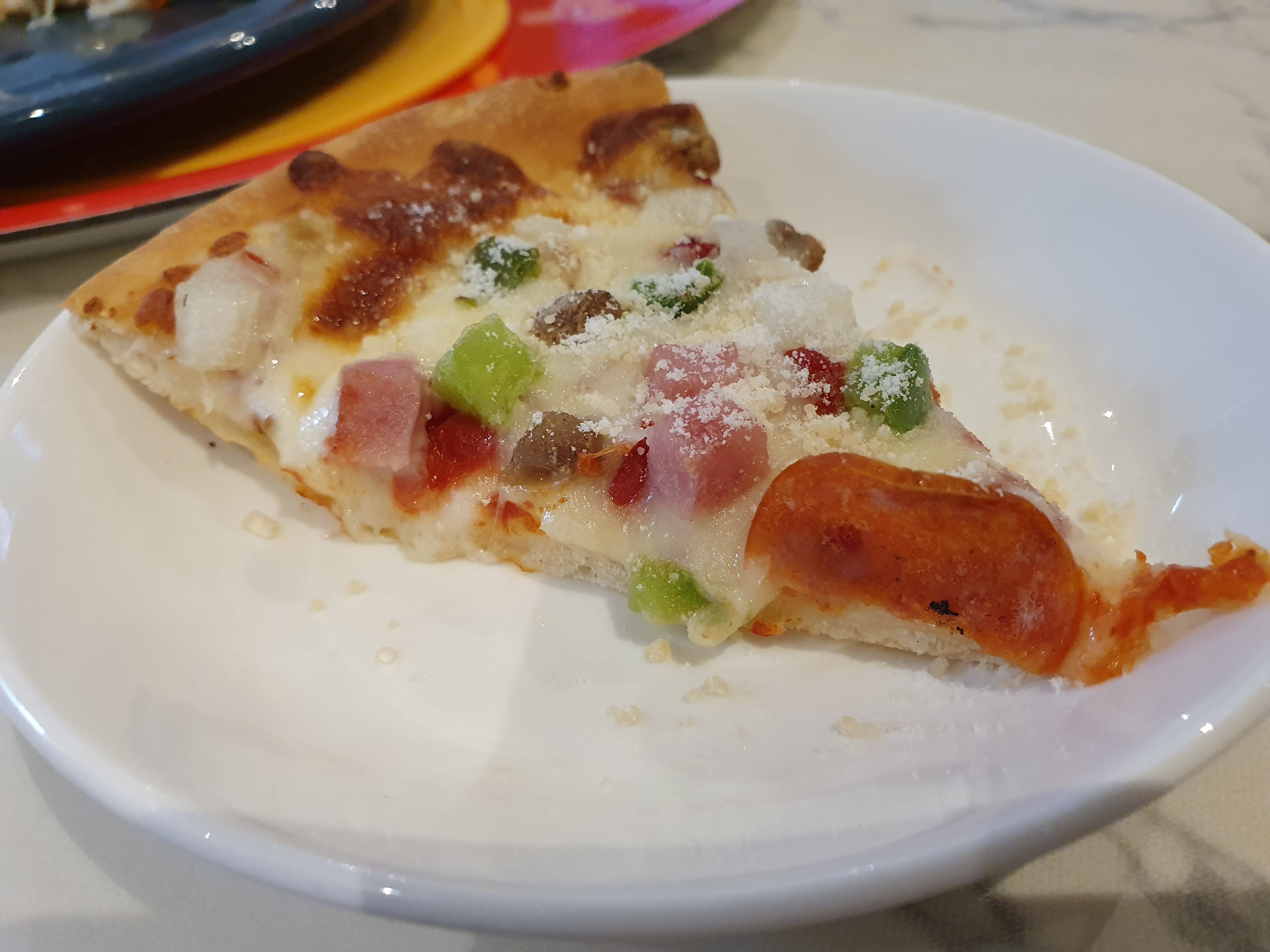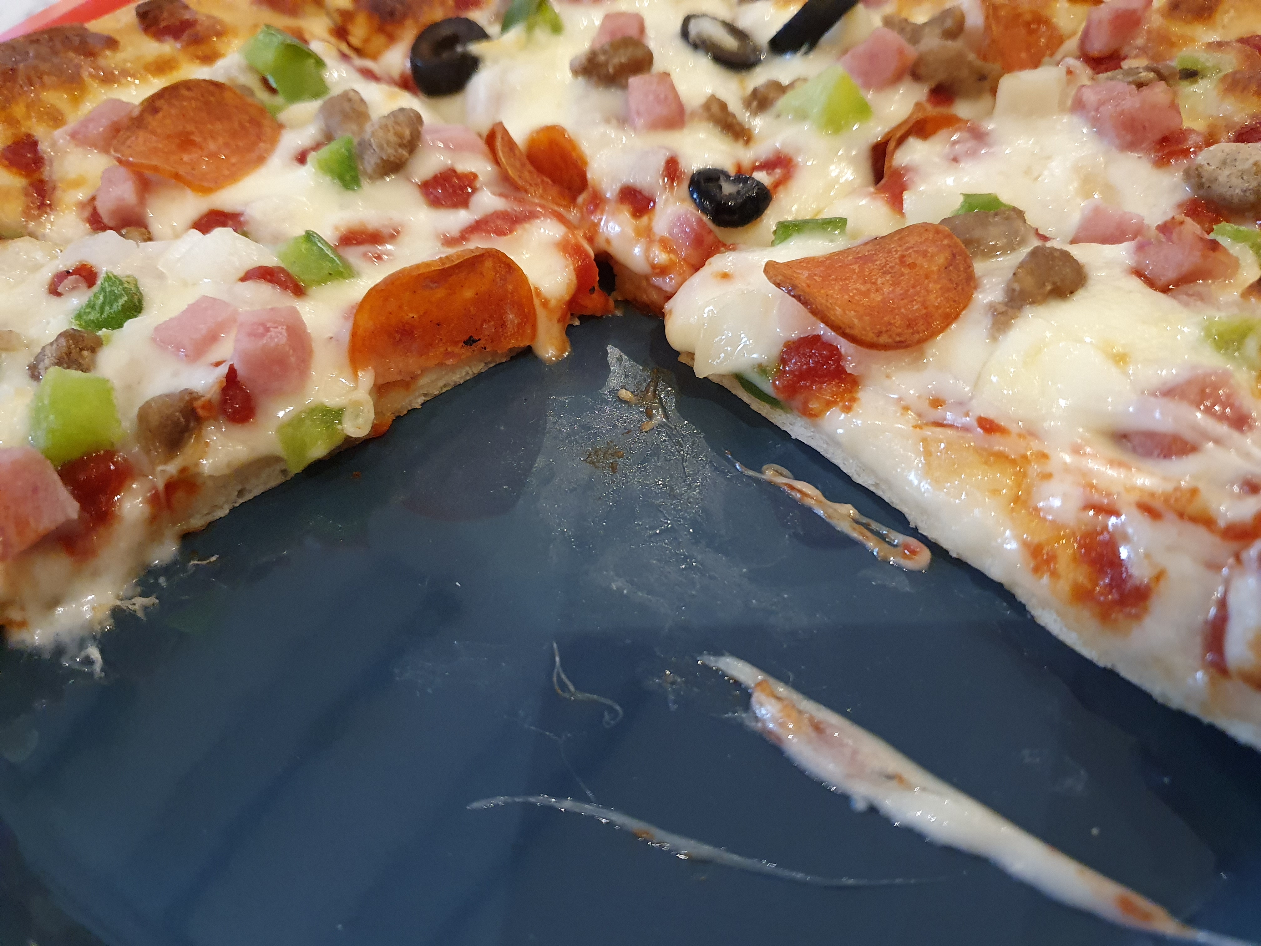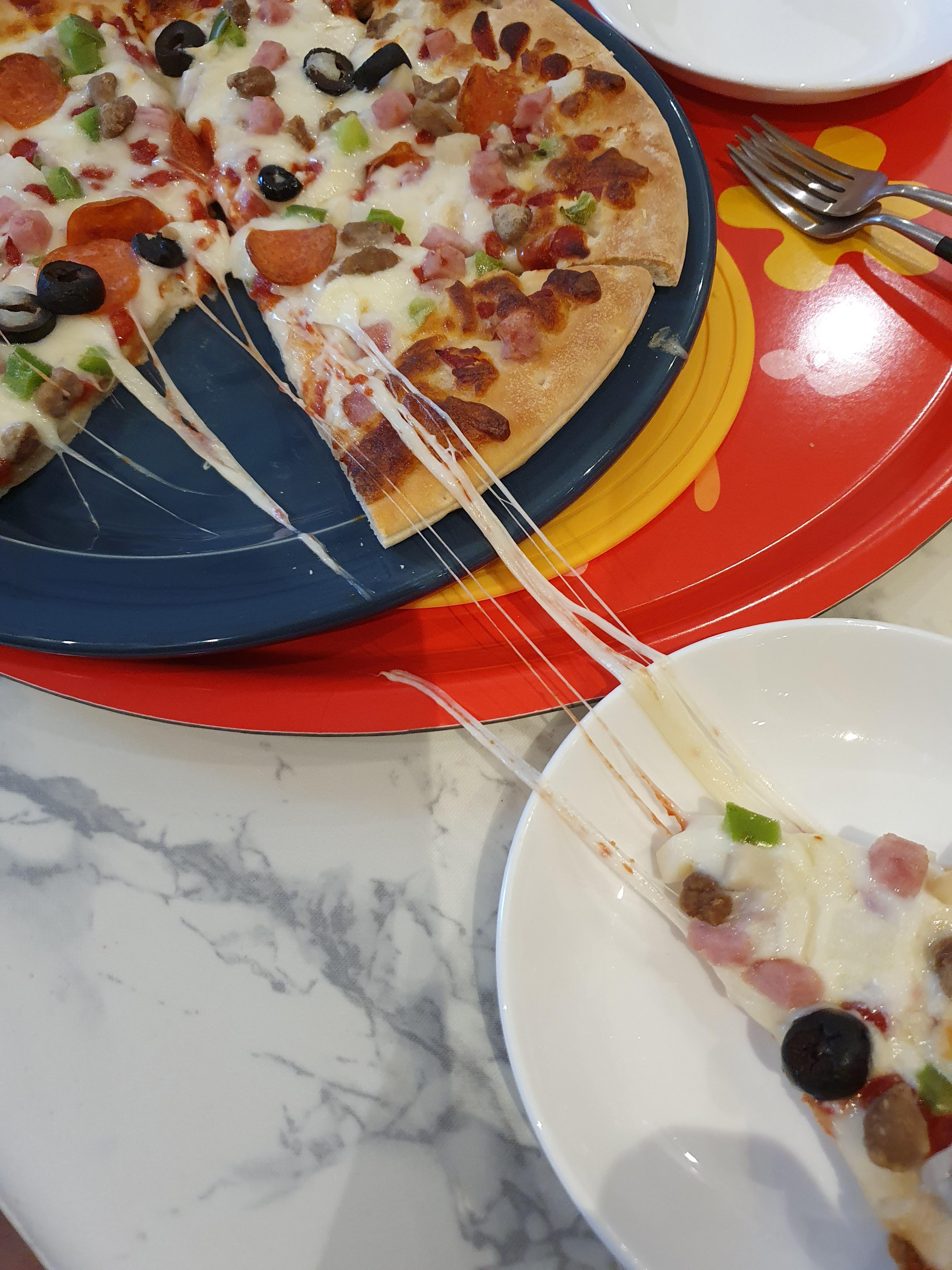 피자 도우 두께와 치즈의 두께가 비슷하다는 느낌입니다. 두껍지 않고, 팬 피자처럼 엄청 얇진 않지만 어중간한 도우 두께만큼 치즈가 올라와 좋았습니다.