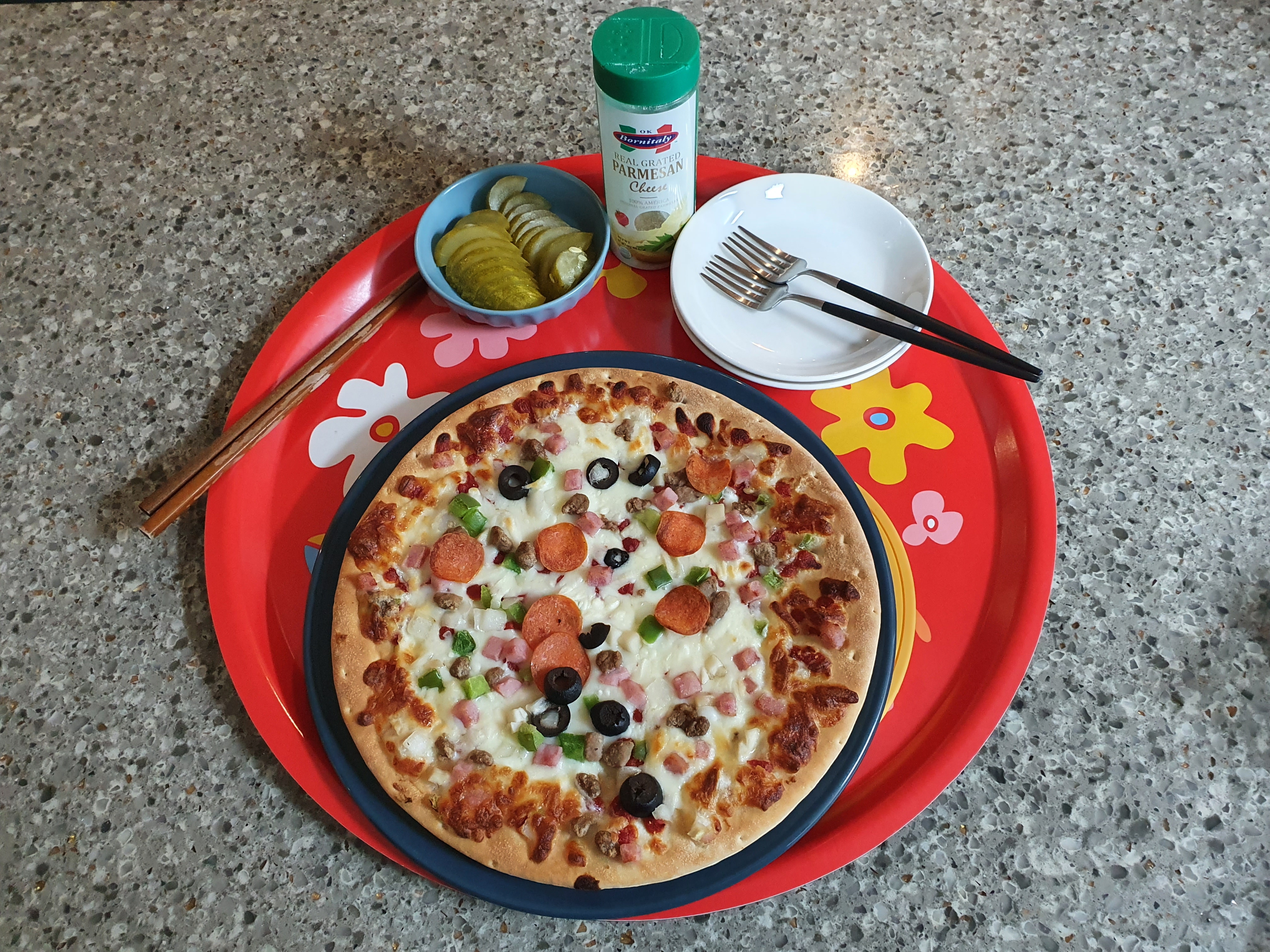 썰어서 준비한 피클과 파마산 치즈를 추가하고 피자를 덜어 먹을 접시까지 완벽하게 준비합니다.