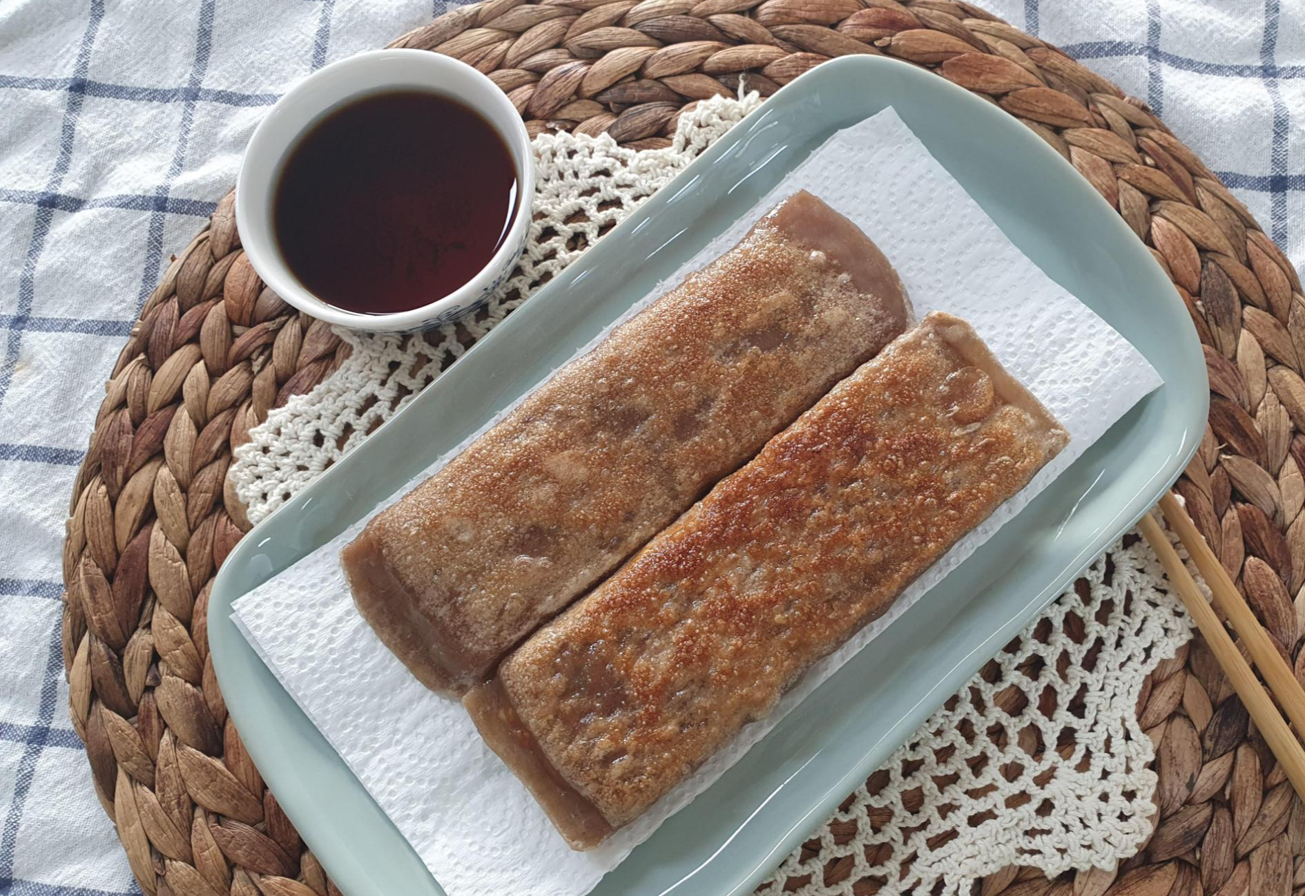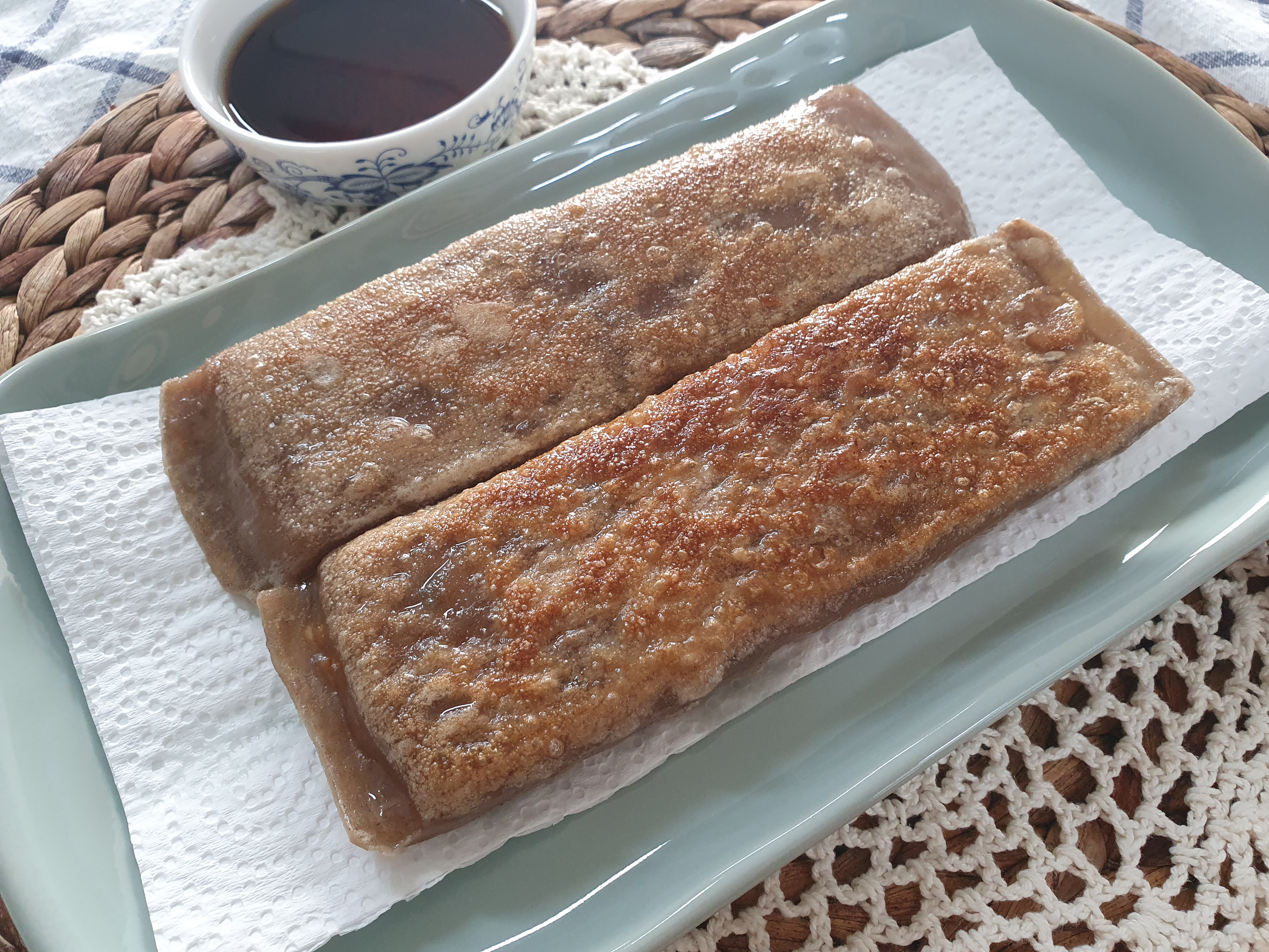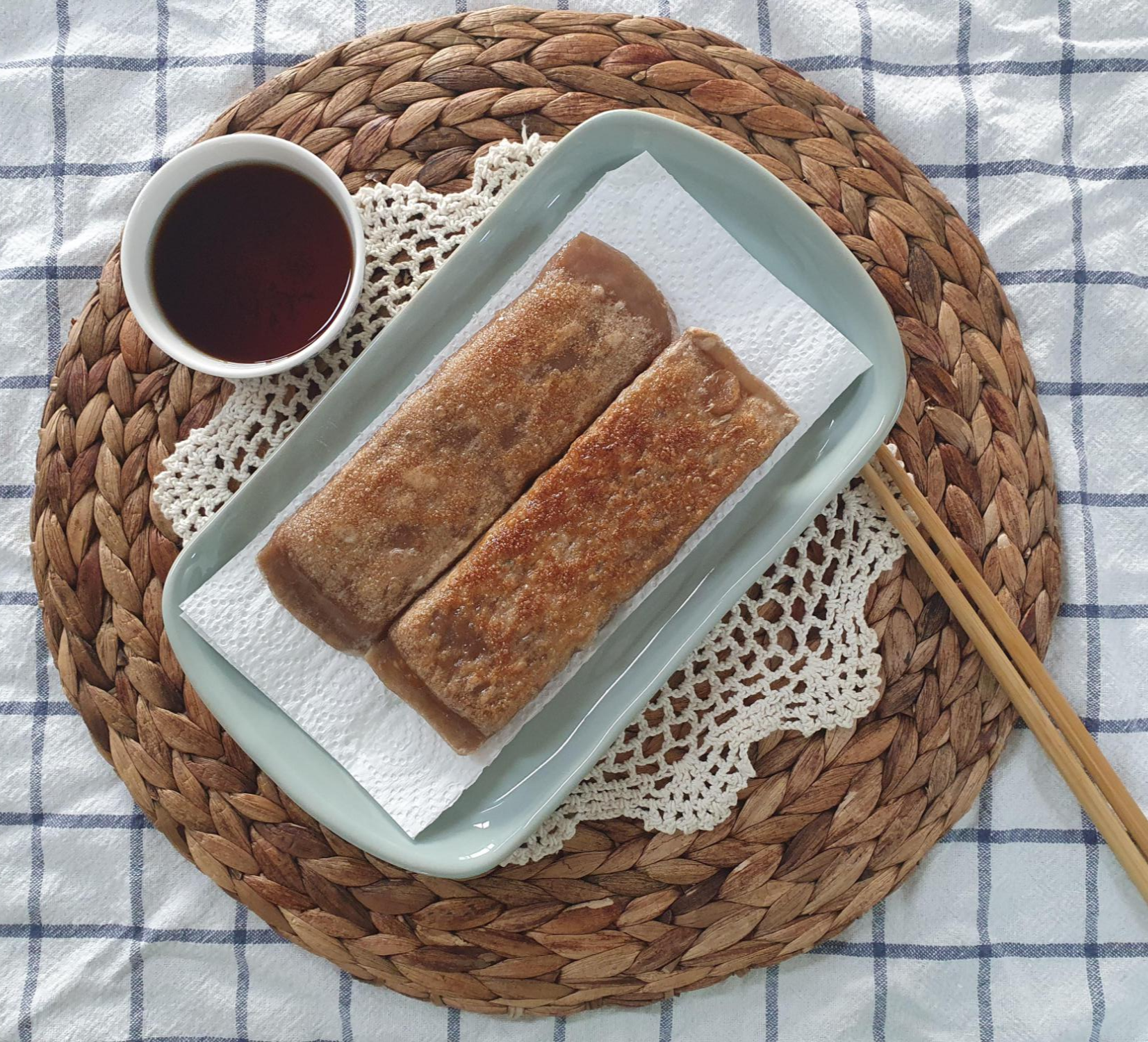 큼직하니 아주 먹음직스럽습니다. 기름에 구워낸 전병이기 때문에 키친타월을 깔아서 기름기 제거에 도움이 되도록 깔아준 것 참고해 주세요.