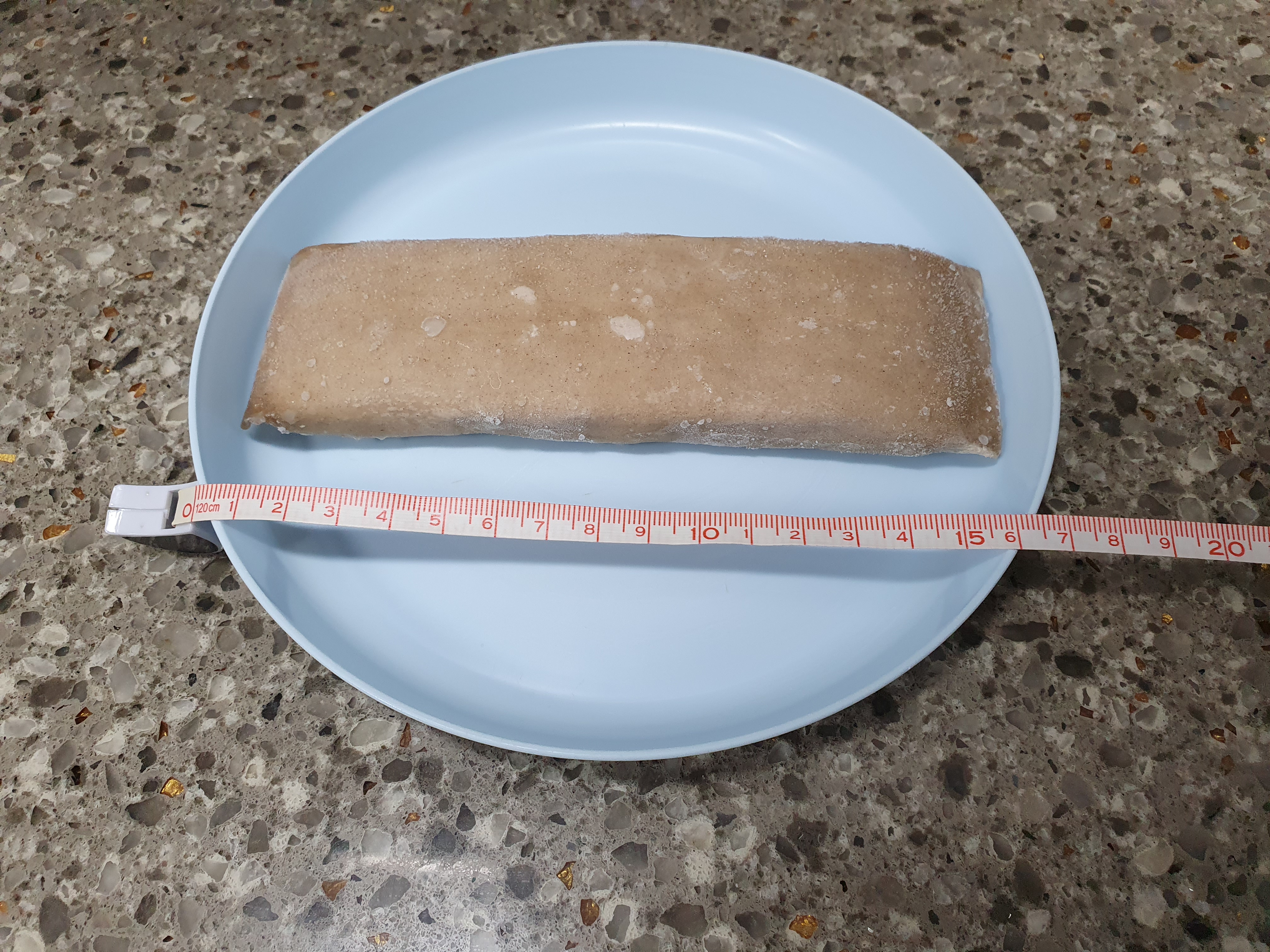 꽁꽁 얼어있는 전병의 크기를 체크해보려고 1개를 아이 접시에 꺼내 보았습니다. 아이 접시 지름만 한 길이네요.