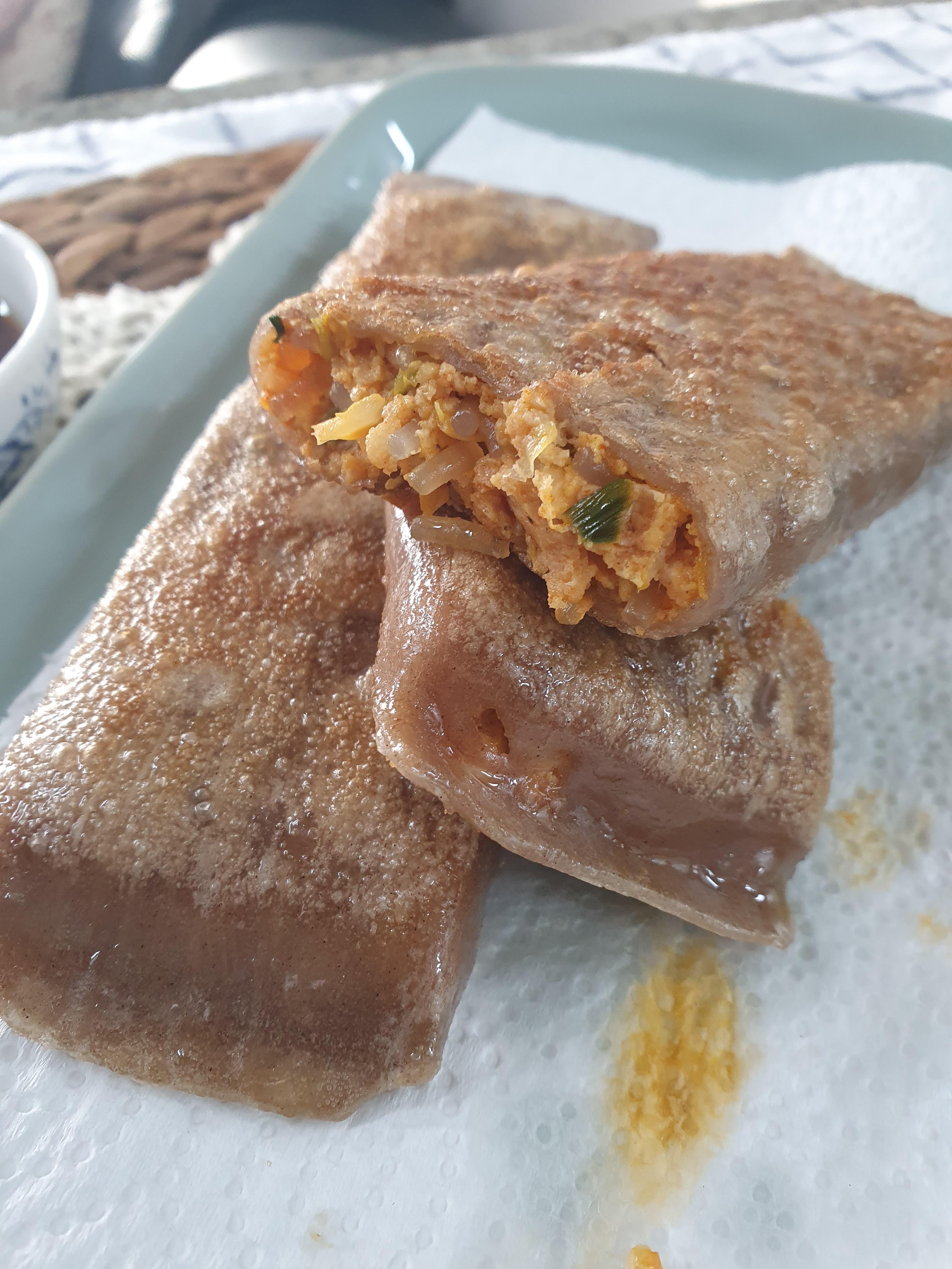 김치 전병이라 그런지 속이 빨갛고 당면들과 다른 재료들이 많이 들어있는 것 같습니다.
