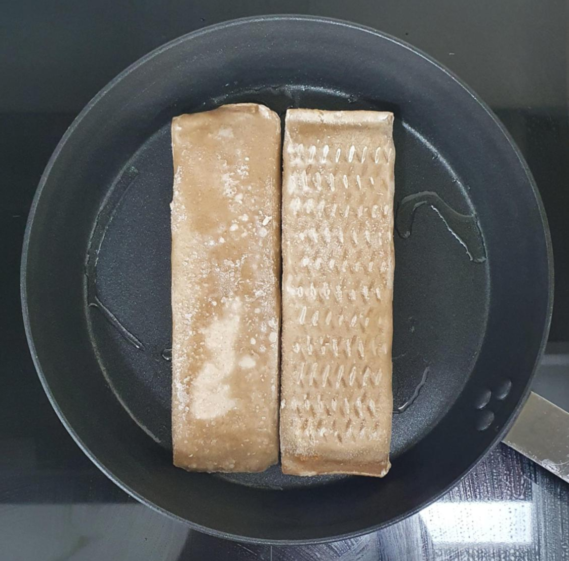 패키지에 적혀있는대로 팬에 기름을 두른 뒤에 메밀 김치 전병을 올려놓습니다. 노릇하게 익혀가면서 맛나게 구워지고 있습니다.