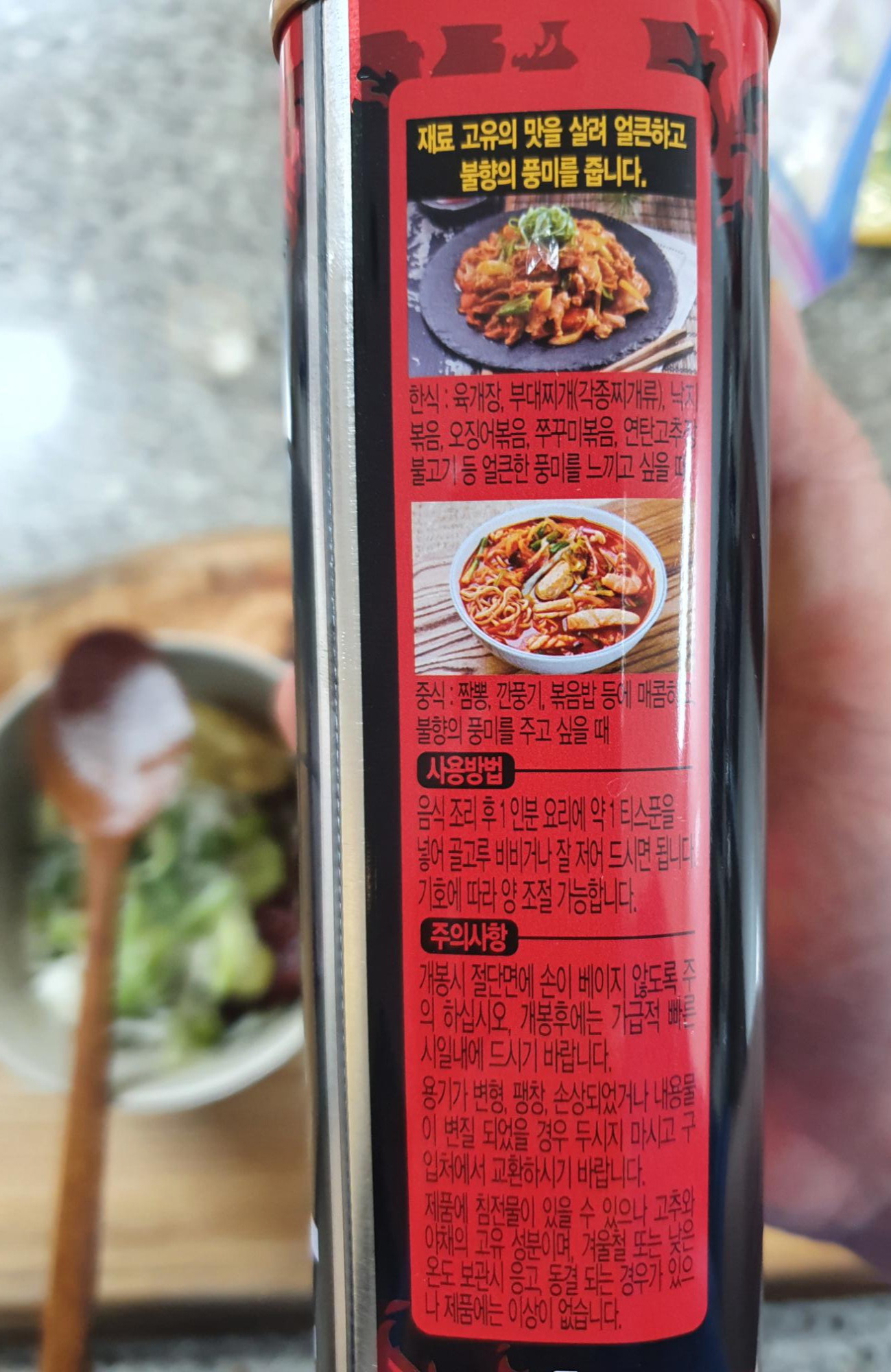 빨간 빛깔이 특징이고, 매콤하게 먹고 싶은 볶음류나 국물류 모두 사용이 가능한 것으로 나와있어요. 처음 사용해보니 기대가 살짝 됩니다. ( 설명서에 불향의 풍미를 느낄 수 있다고 하는데 궁금해지네요. )