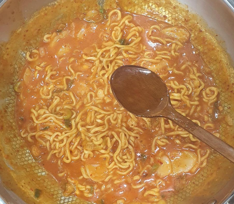 면을 넣을 때 물의 양도 맞추시는 것이 좋습니다. 물은 라면 끓일 때 맞추는 물 이상 정도 넣어주셔야 좋아요. 양념이 물을 가져가고 면도 물을 가져가니까 약 600ml ~650ml 물이면 충분할 것입니다.