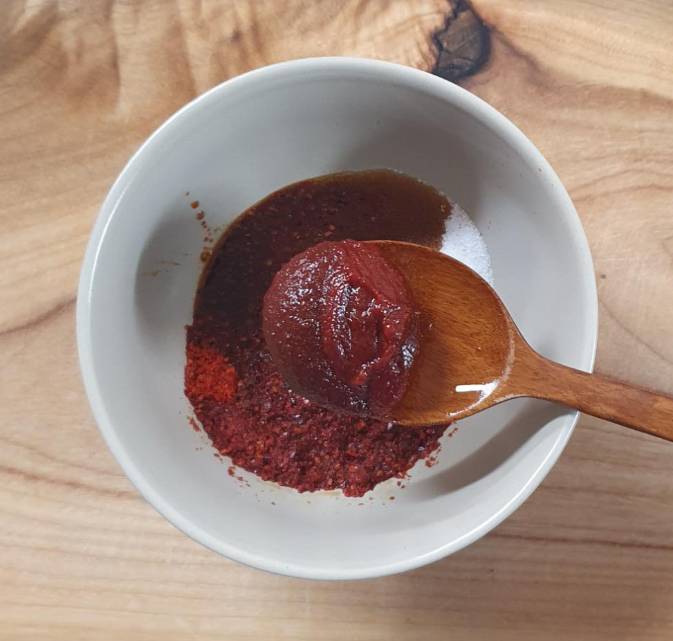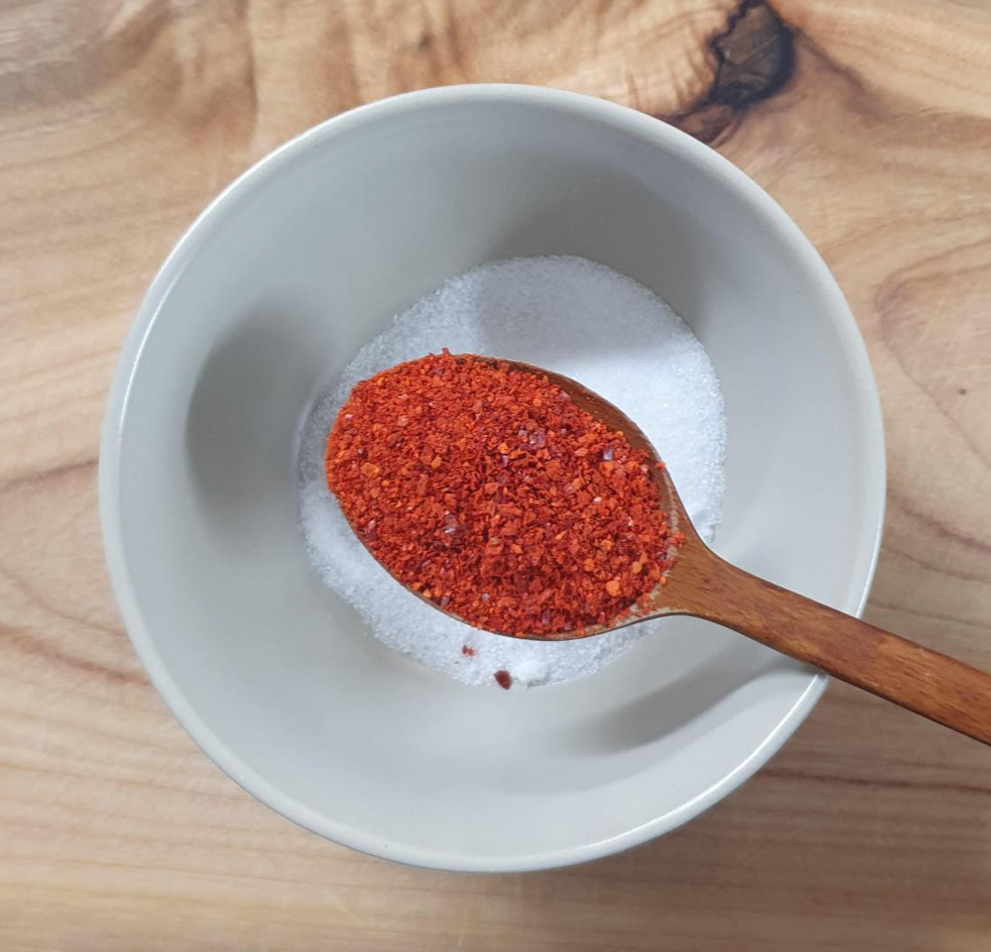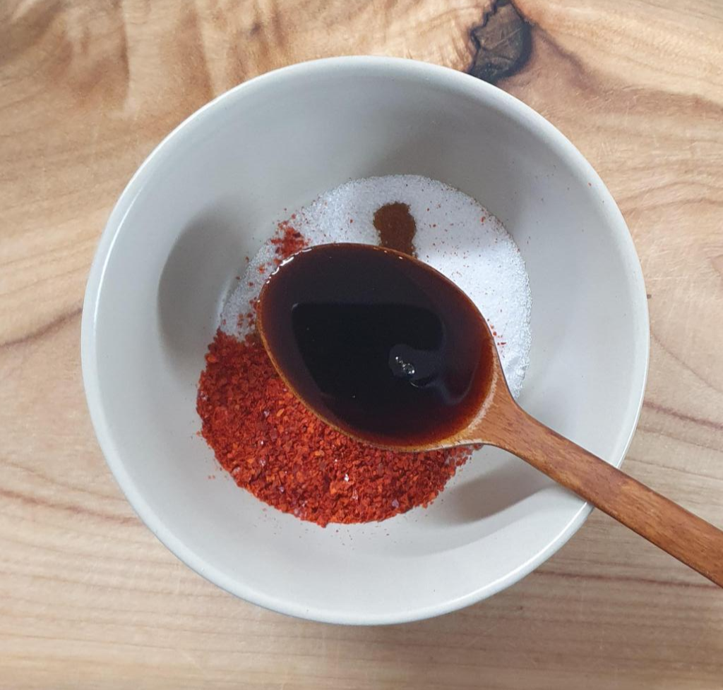 그리고 매콤한 맛을 내기 위한 재료 중 1가지인 고춧가루를 1스푼 추가해 주세요.