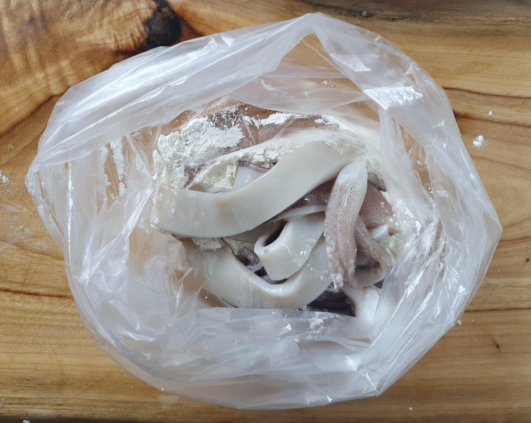 튀김가루를 담은 상태에서 먹기 좋은 크기로 손질된 오징어를 봉지에 넣고 흔들어서 섞어 주세요.