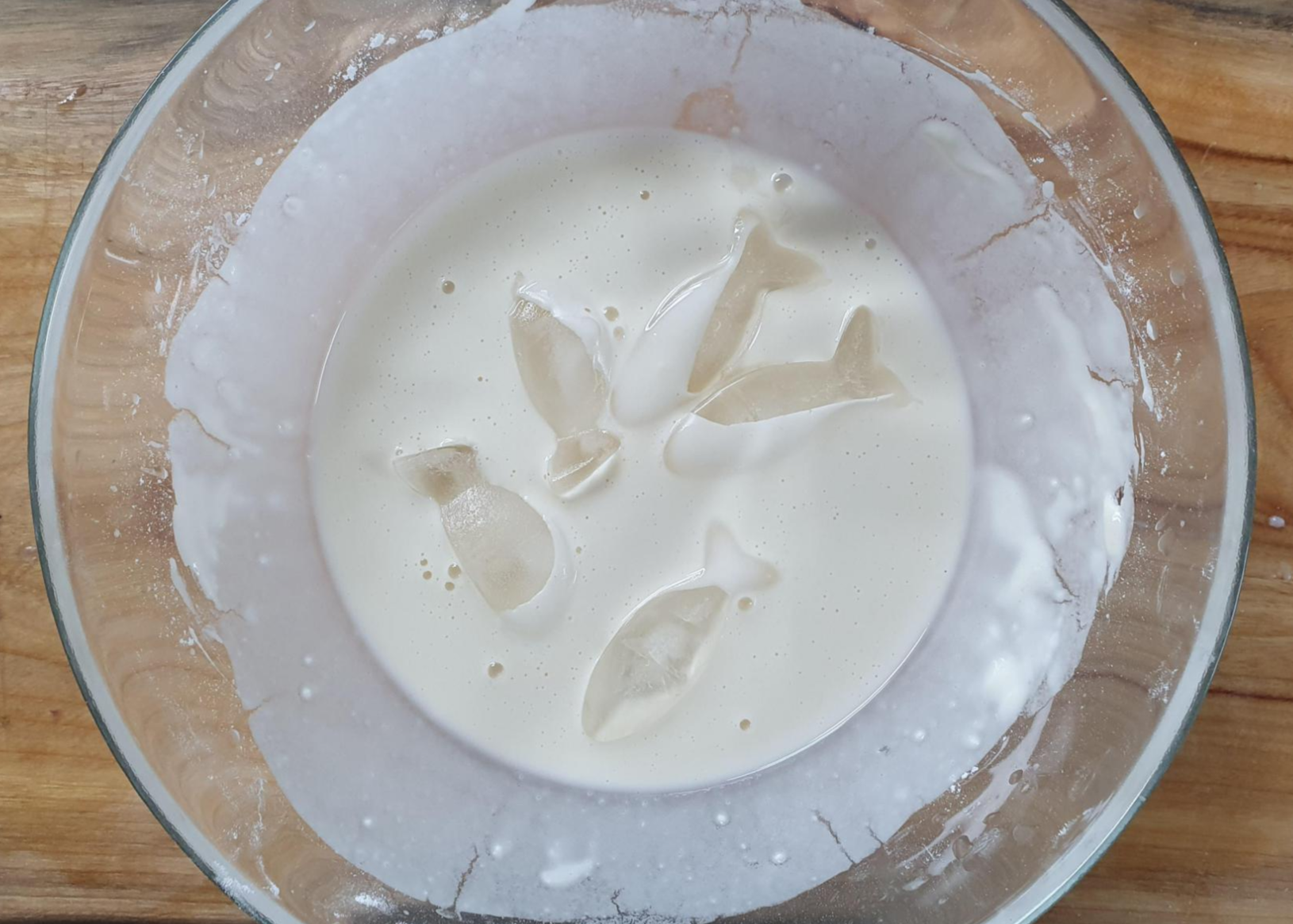 차가운 반죽을 이용하기 위해서 얼음을 반죽에 추가하여 차갑게 반죽의 온도를 유지시켜 주세요.